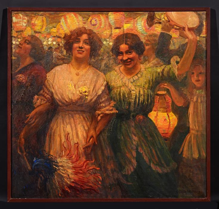 Zwei Tanzende beim Lampionfest. Signiert unten rechts: Marius J. Richters. Öl auf Leinwand. 110,5 x 115cm. Rahmen.