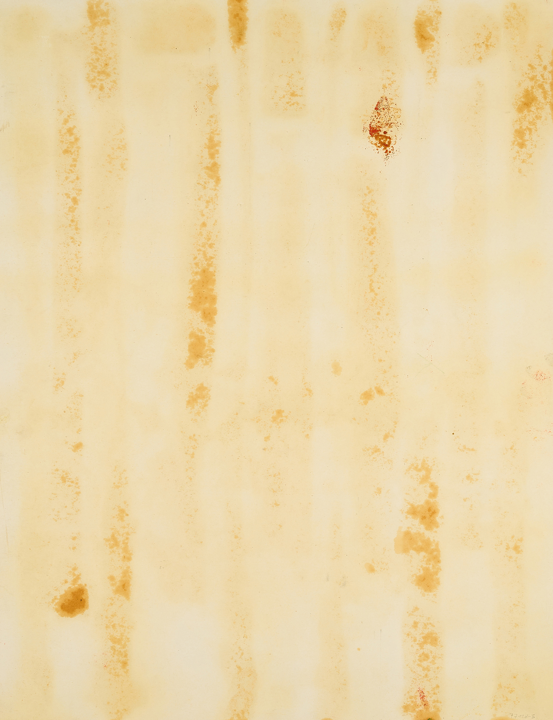 Herstellungsbedingt leicht gewellt. Bereibung mit leichtem Materialverlust. Riss in der obersten Papierschicht unten links (ca. 1,5cm). Vereinzelt leichte Bestoßungen der Kanten. Vereinzelt leichte Bereibungen der Ränder am Blatt unten. Arbeitsspuren. Minimal gebräunt. Verso Arbeitsspuren und Spuren alter Montierung (Rückseite klebt). Ansonsten guter Zustand