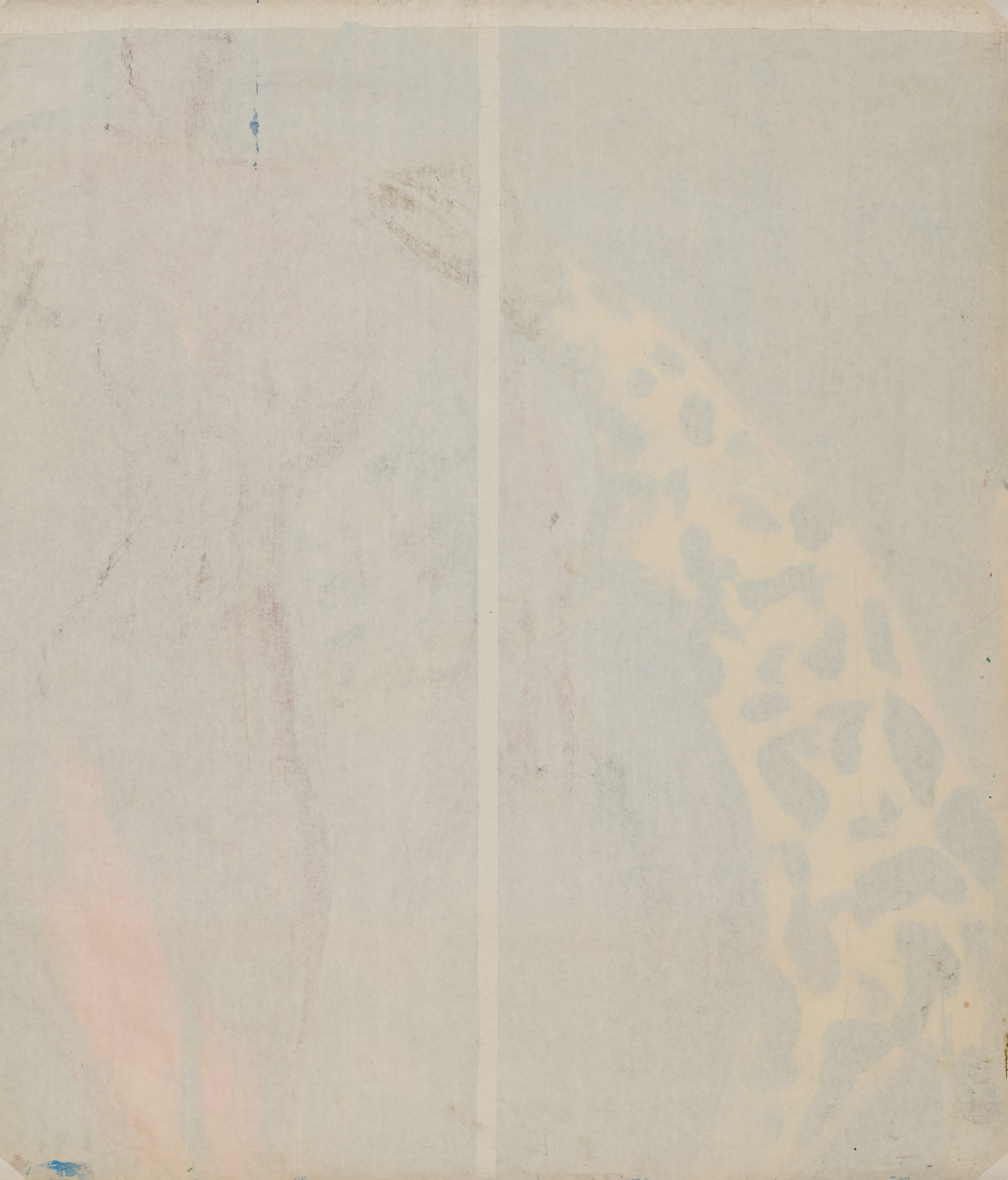 Leicht gewellt, leicht knickfaltig. Stecknadellöcher in den Randbereichen. Leichte Knickspuren in den Randbereichen und vereinzelt kleine Einrisse (alles herstellungsbedingt). Verso an den Ecken verstärkt. Arbeitsspuren. Ansonsten guter Zustand.