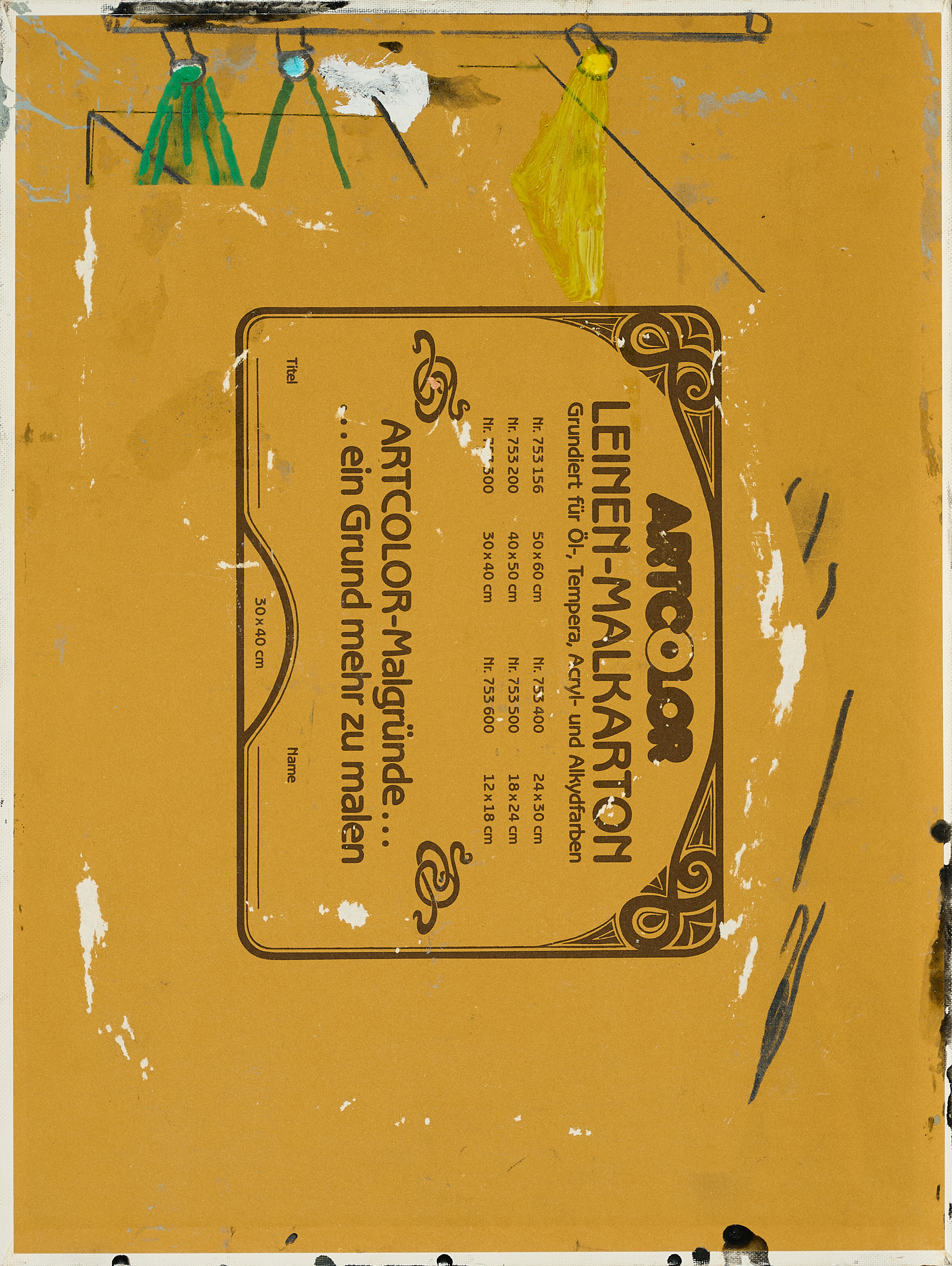 Leichtes Krakelee an zwei Stellen mit leichten Abplatzungen (max. ca. 3 x 3cm). Minimale Verschmutzungen an den Stickern. Verso Arbeitsspuren. Ansonsten guter Zustand.