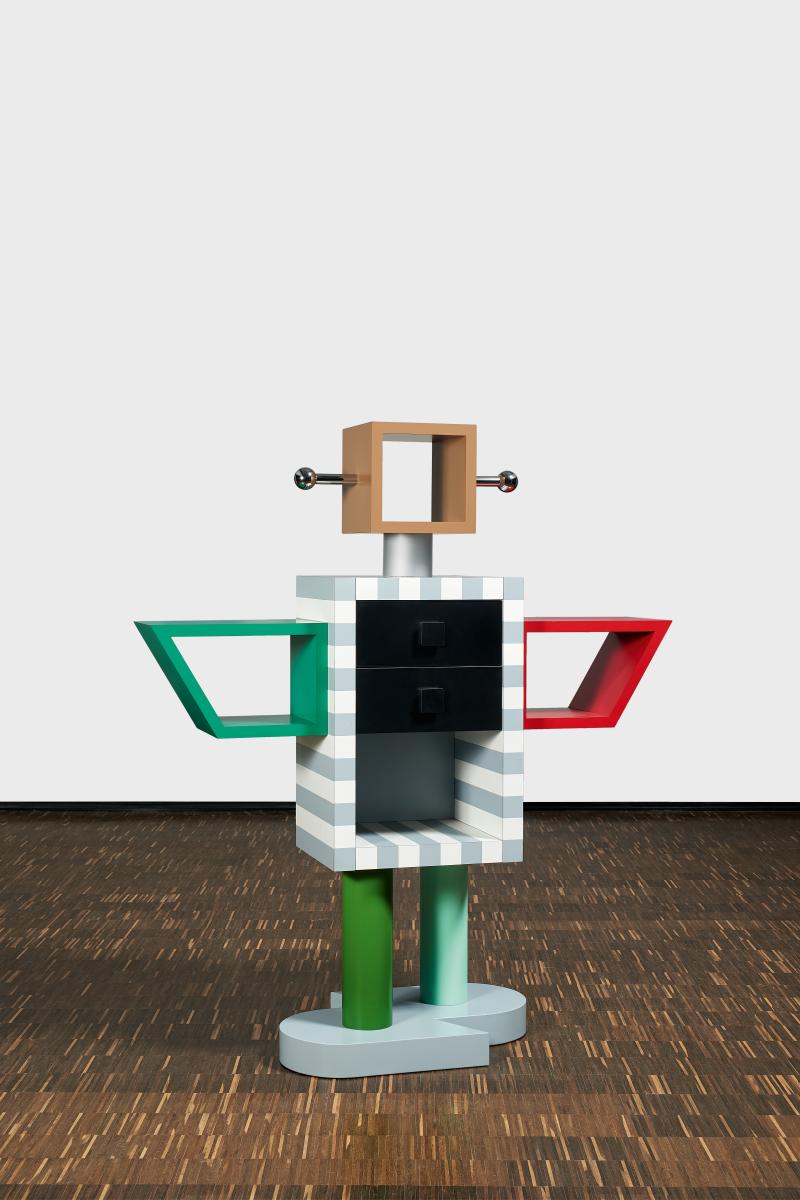 Ginza. 1982 (Entwurf), 2002 (Herstellung). Verchromtes Metall sowie Holz und HPL Laminat, bunt bedruckt. Ca. 175 x 151 x 54cm. Datiert und signiert auf der Rückseite: 2002 M. Umeda sowie nochmals auf Japanisch signiert. Memphis Milano (Hersteller).