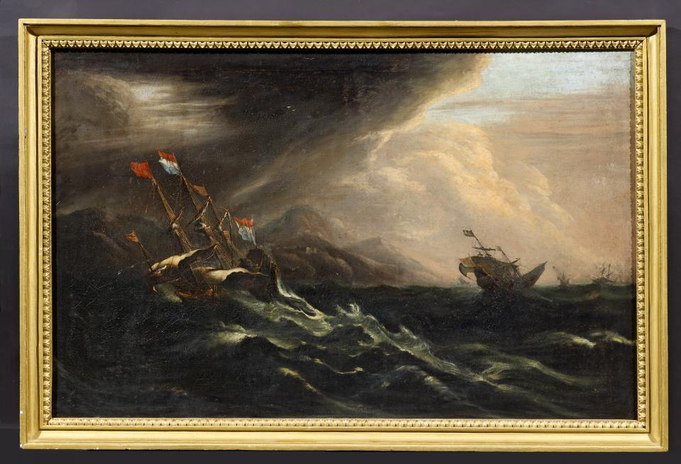 Gewittersturm an der Küste. Öl auf Leinwand. Randdoubliert. 98,5 x 155cm. Rahmen.