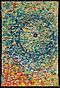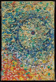 Als farbiges, pastoses Flirren begegnet uns diese kleinformatige Arbeit. Gelb herrscht vor; in der oberen Bildhälfte kombiniert mit Blau und ihrer beider Mischfarbe Grün. Das untere linke Bildviertel wird von Orange-Rot dominiert. In diesem Farbflimmern fällt die runde blaue Kontur ins Auge, die ein kleines rotes, von schwarzem Schatten umgebenes Zentrum hat. In Max Ernsts Bildwelt ist die kreisrunde Form als Sonne, Vollmond oder sonstiger Planet vertraut, begegnet aber auch als Iris mit stecknadelkopfkleiner Pupille. Es ist evident, dass das Runde hier auch an eine weibliche Brust erinnert. Max Ernsts Kunst fordert den Betrachter immer zu freier Assoziation auf; hier gibt der Maler aber ausnahmsweise einen deutlichen Hinweis zur Interpretation. Unterhalb der runden Form steht in weißer zu blauer Schrift wechselnd: VINCENT. Die Buchstaben sind in der pastosen, farbigen Unruhe nicht direkt erkennbar. Auf der Rückseite des Gemäldes hat der Maler die Leinwand zudem betitelt: "L'oeil de Vincent" (Vincents Auge). Tatsächlich erinnern der nervös flimmernde Farbauftrag wie auch die verwendete Farbpalette stark an Gemälde Vincent van Goghs. Der "Prototyp" des zu Lebzeiten unverstandenen Künstlers, dessen Werk heute zum kollektiven Bildgedächtnis von Generationen gehört, war ein wichtiges Vorbild Max Ernsts. Eines seiner ersten bekannten Gemälde "Landschaft mit Sonne" (1909) zeigt die frühe Nähe Ernsts zum berühmten Niederländer (Abb. 1) und in einem Zeitschriftenbeitrag von 1942 (Ford, Charles Henry (Hrsg.), View: Through the eye of poets. Max Ernst Sondernummer. Serie Nr. I, New York, April 1942), in dem Max Ernst seine liebsten Dichter und Maler typographisch darstellt, ist Van Gogh als einem der wenigen Modernen ein Platz sicher (Abb. 2). Im Entstehungsjahr des Gemäldes 1958, erlangt Max Ernst die französische Staatsbürgerschaft. Auch diese zweite Heimat verbindet ihn mit seinem Vorbild.