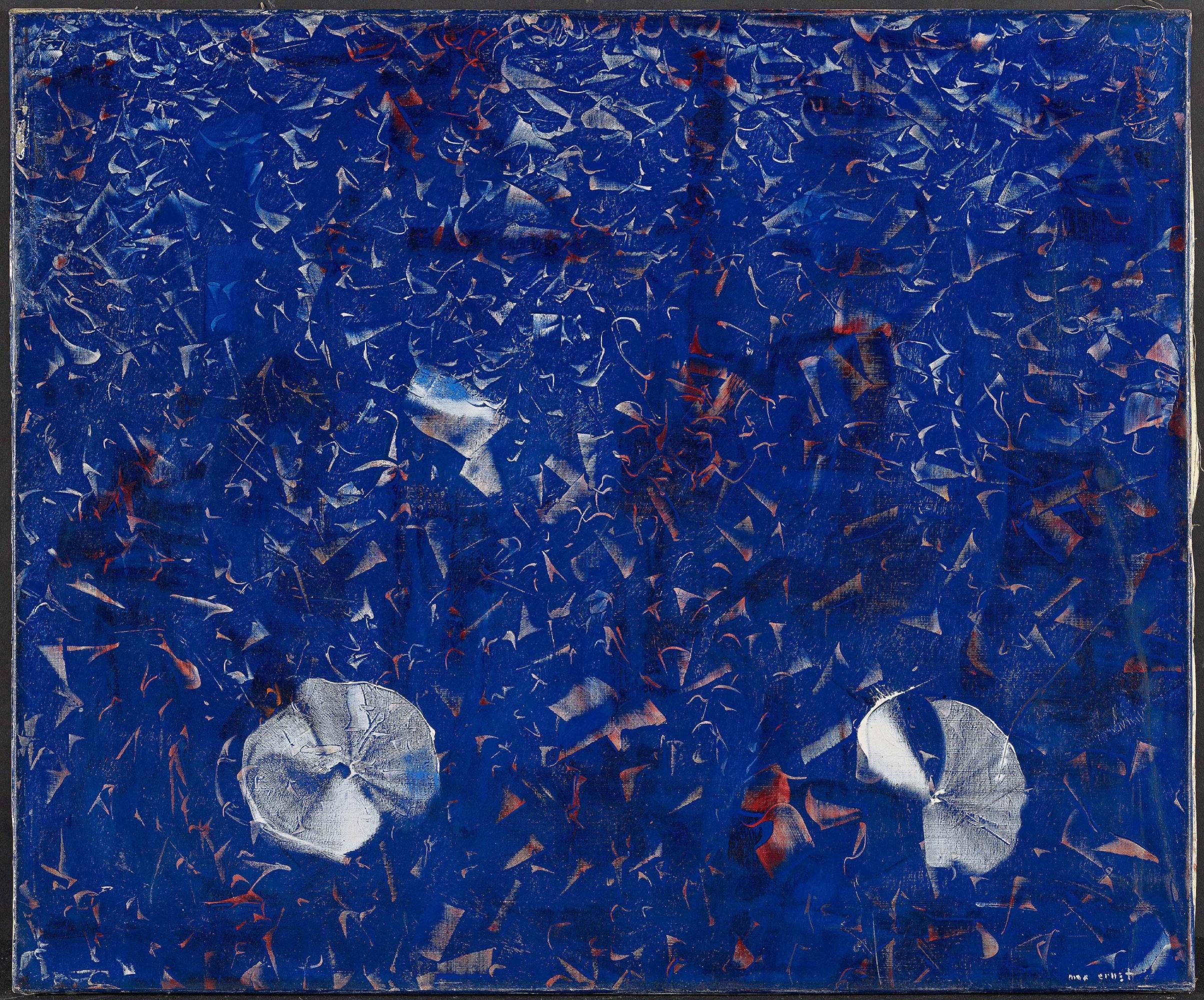 Bezeichnung: Signiert unten rechts: max ernst. Nochmals signiert verso auf Keilrahmen: Max Ernst. Hier zudem betitelt: enseigne pour une école de moustiques.