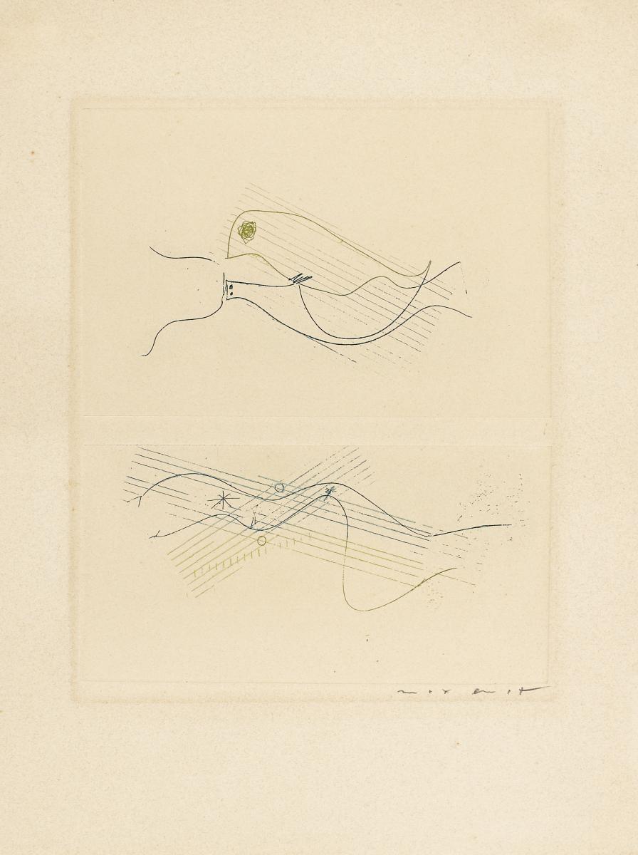 Zu: Ghérasim Luca, L'Extrème-occidentale. 1961. Zwei farbige Kaltnadelradierungen auf Velin. 11,5 x 17,5cm und 9 x 17,5cm (32,5 x 25cm).