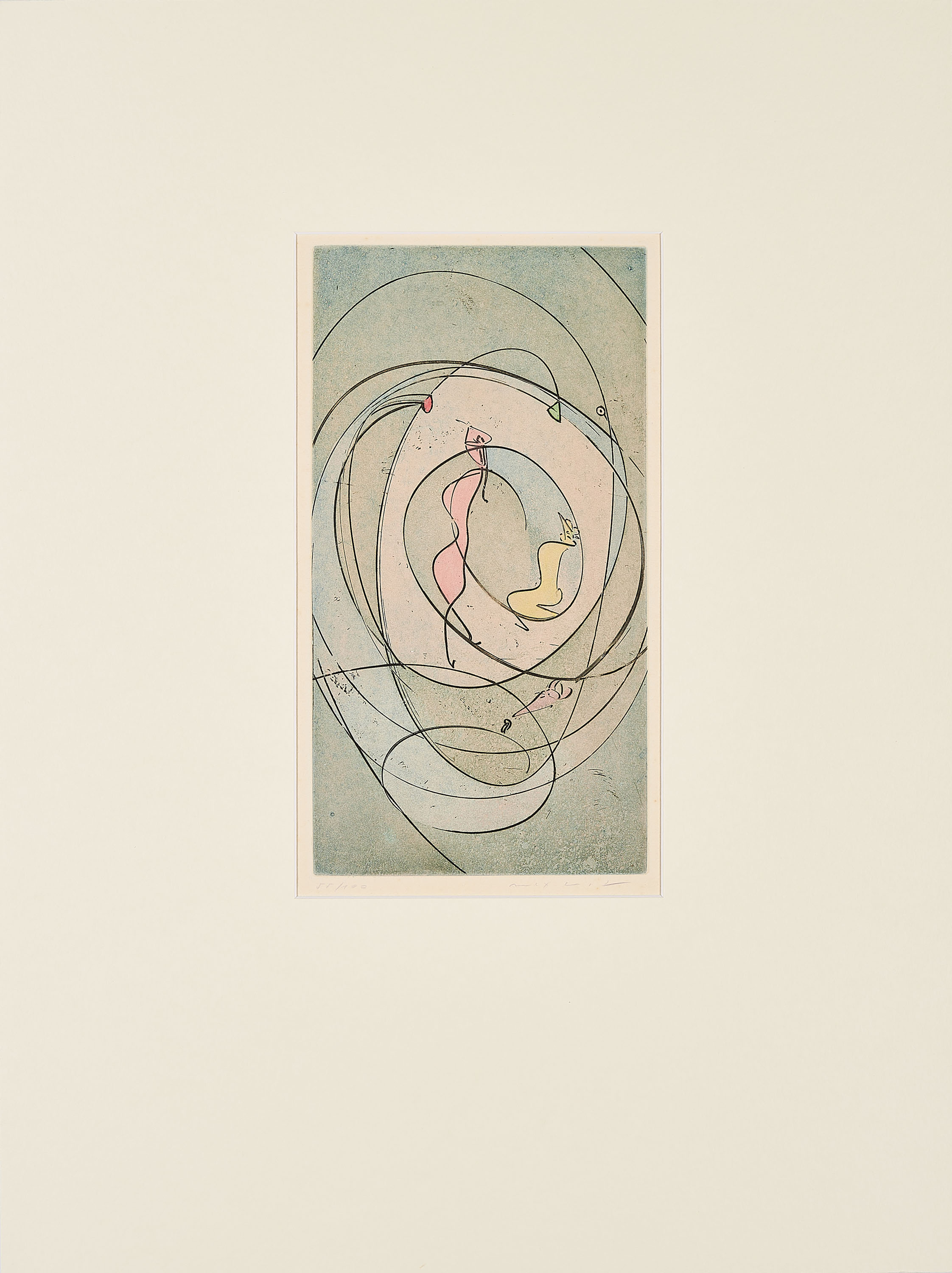 Technik: Farbaquatintaradierung auf Lana (Wasserzeichen: Widderkopf).