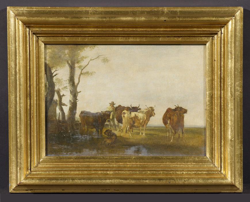 Kuhhirte mit seiner Herde. Öl auf Papier. Auf Karton gelegt. 23 x 33cm. Rahmen.