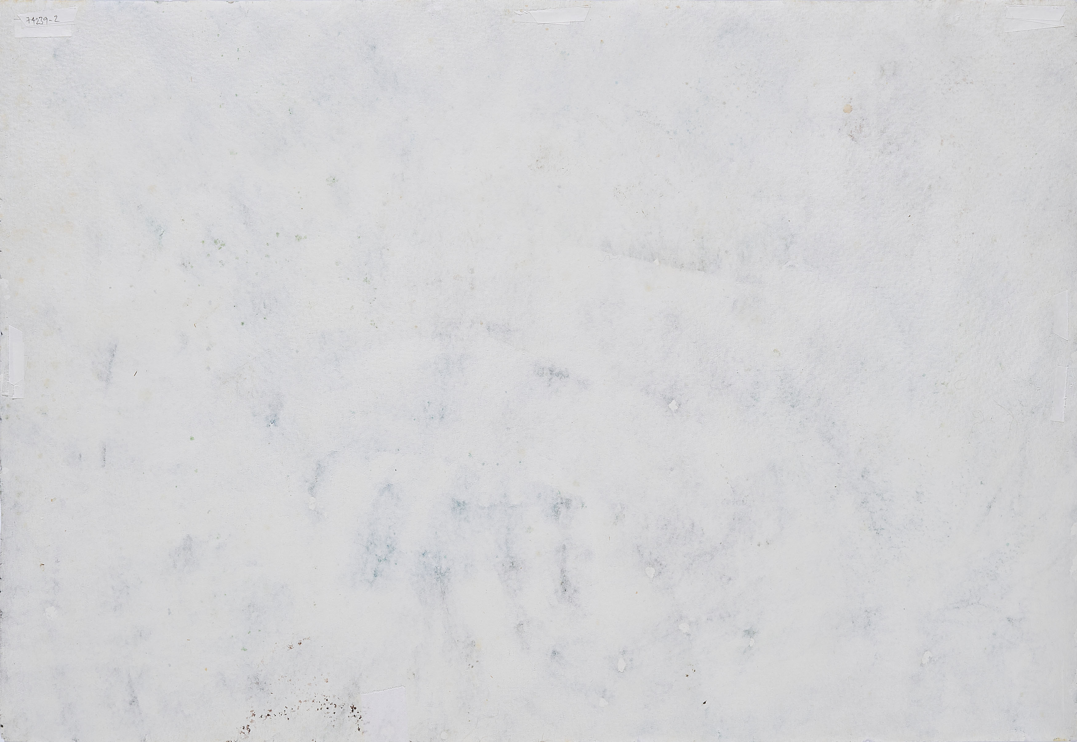 Blatt arbeitsbedingt leicht gewellt. Partiell minimale Papierverluste an der unteren Kante. Kleinerer Papiereinriss (0,5cm) an der oberen Kante links. Verso Reste alter Montierung in den Randbereichen. Ansonsten befindet sich die Arbeit in einem sehr guten Zustand.
