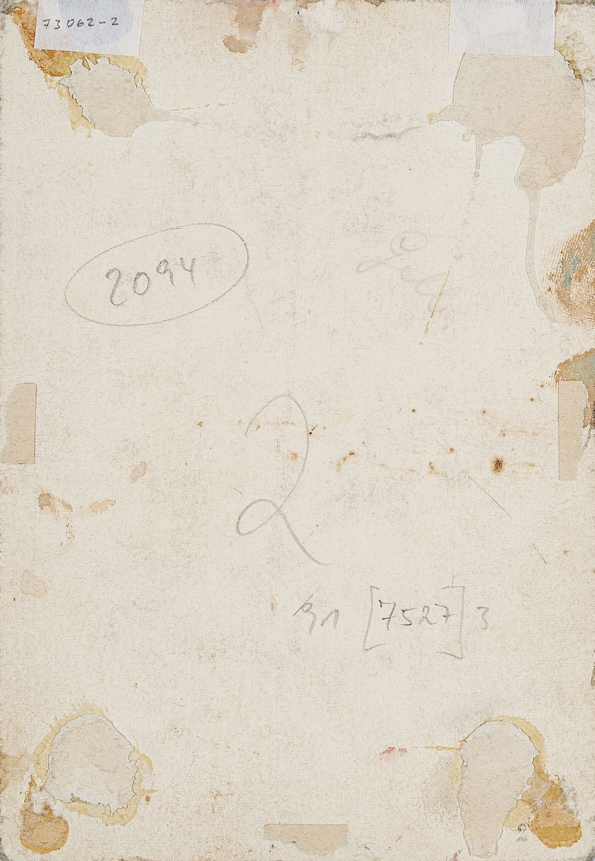 Minimale Bestoßungen der Blattkanten. Verso Reste alter Montierung sowie Arbeitsspuren. Ansonsten sehr guter Zustand.