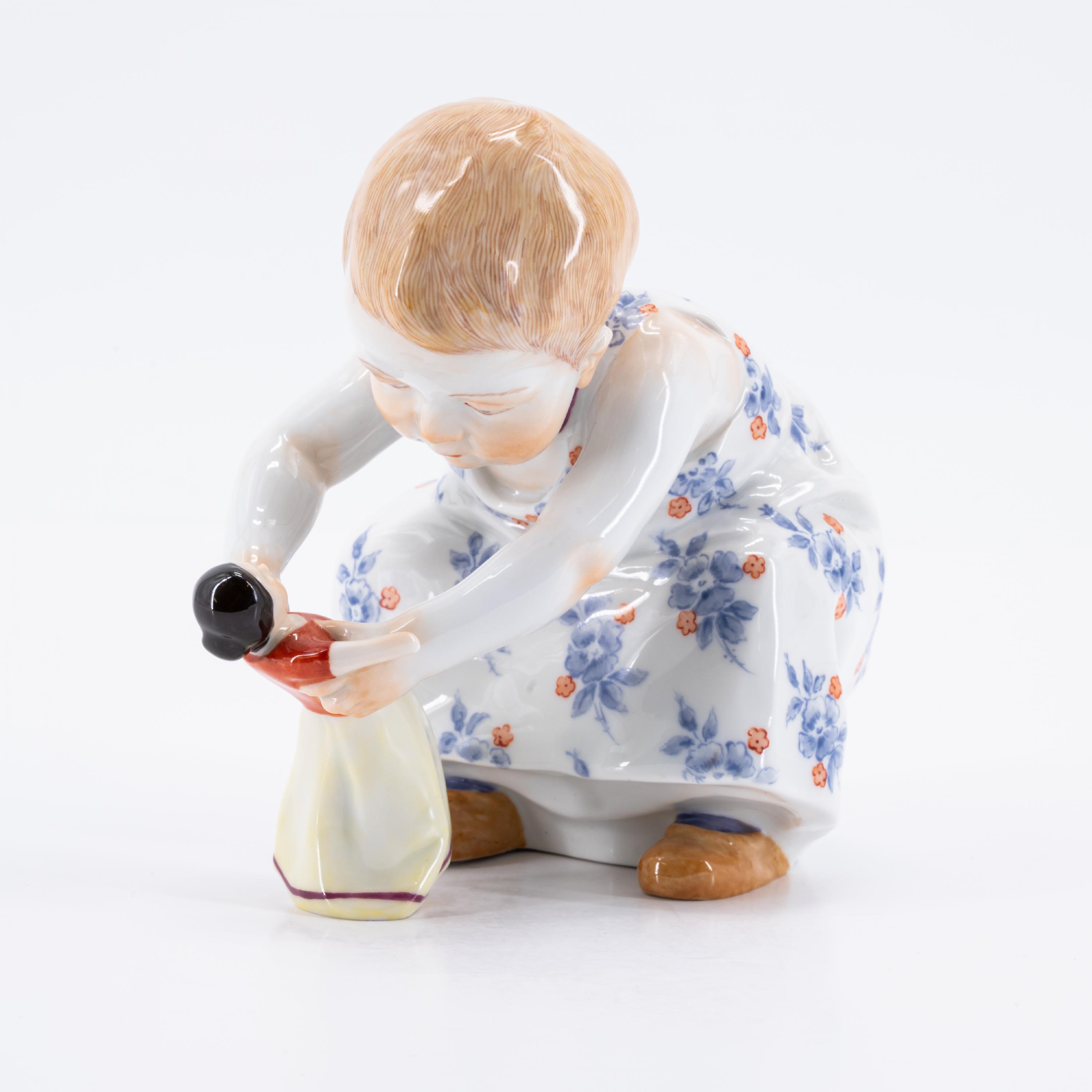 Beschreibung: Mädchen im Blumenkleid, hockend mit einer Puppe spielend.