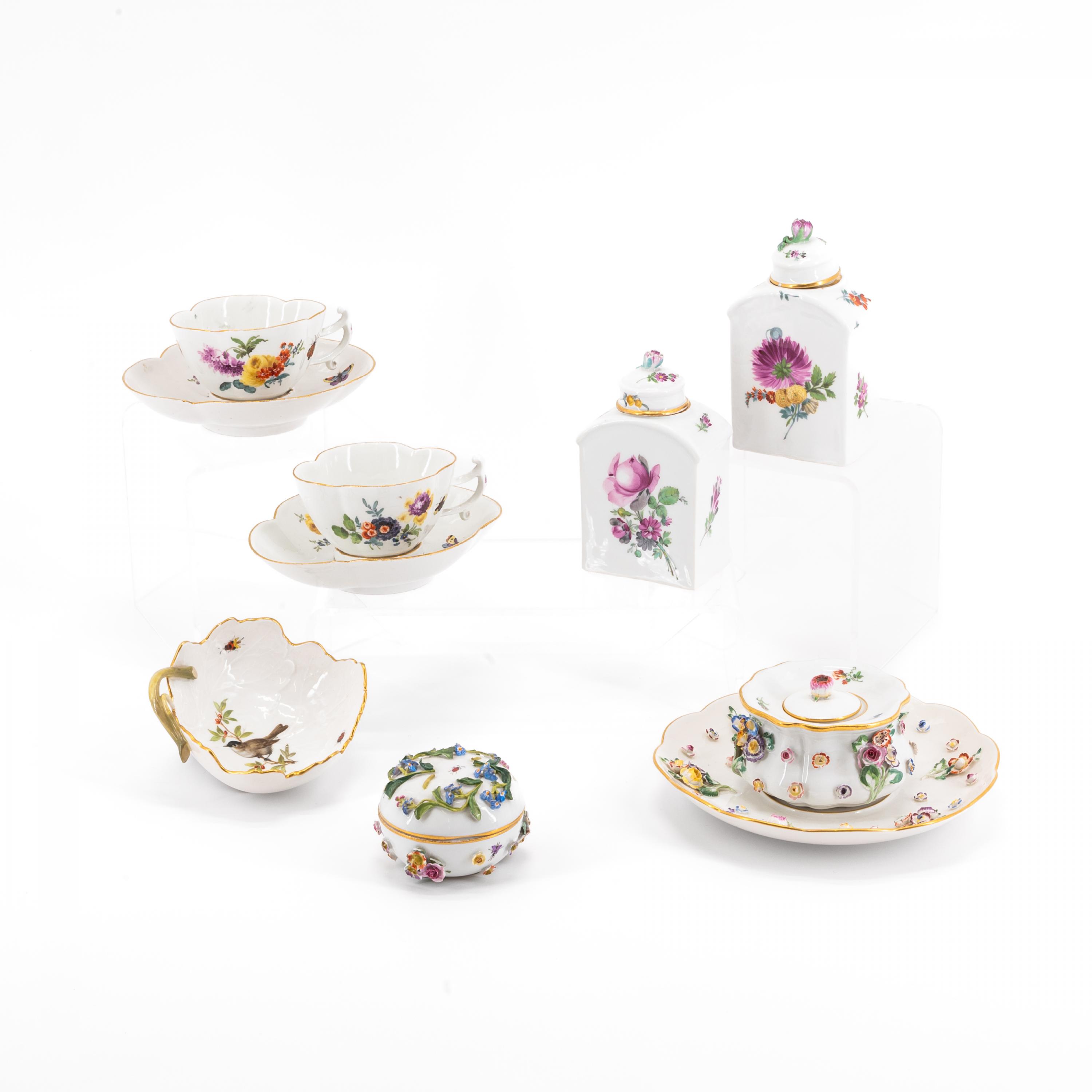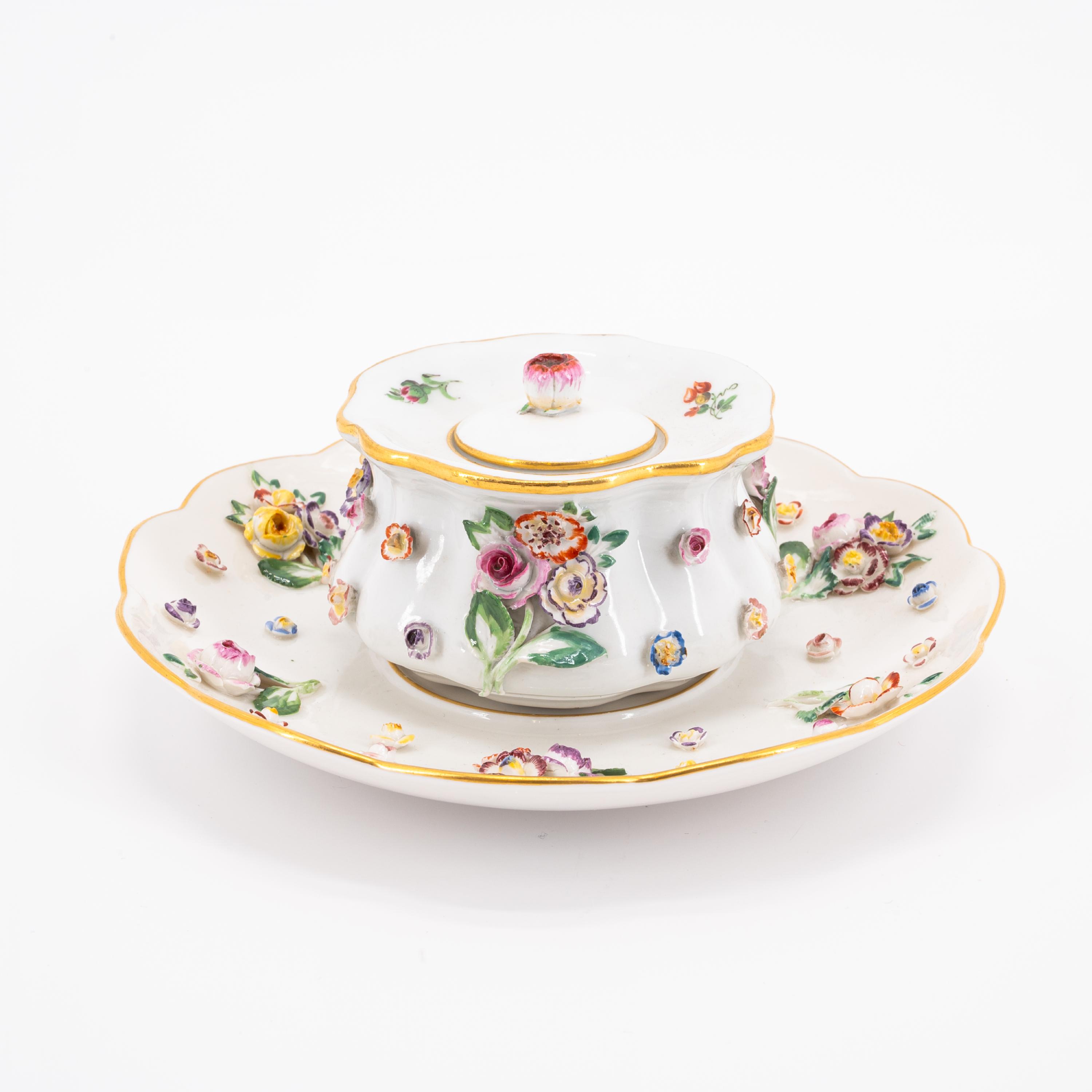 Maße: ø Unterschale Tintengefäß 17cm, Höhe der Teedosen 13cm.