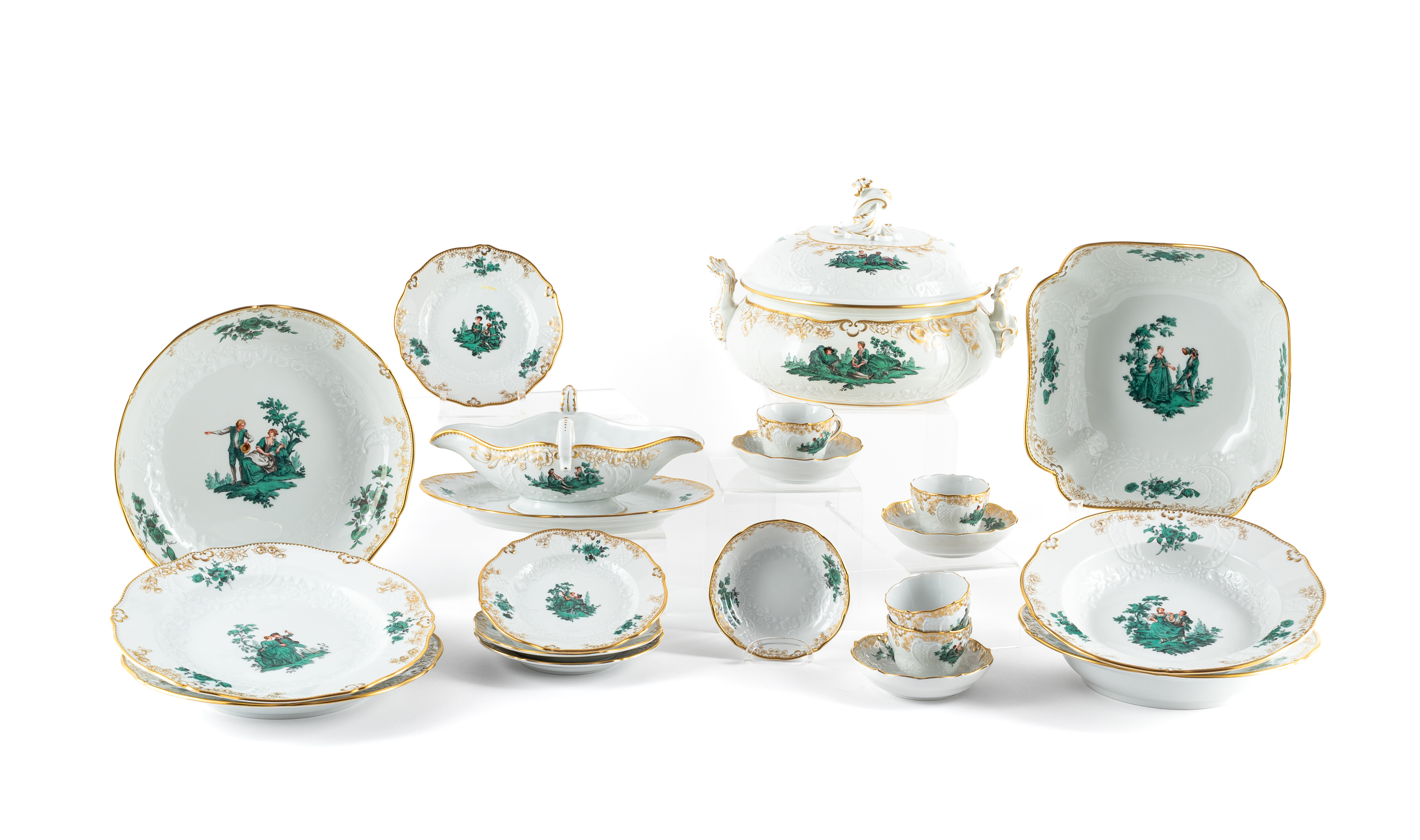 72 TEILE AUS EINEM SPEISESERVICE MIT DEKOR "GRÜNE WATTEAUSZENE".