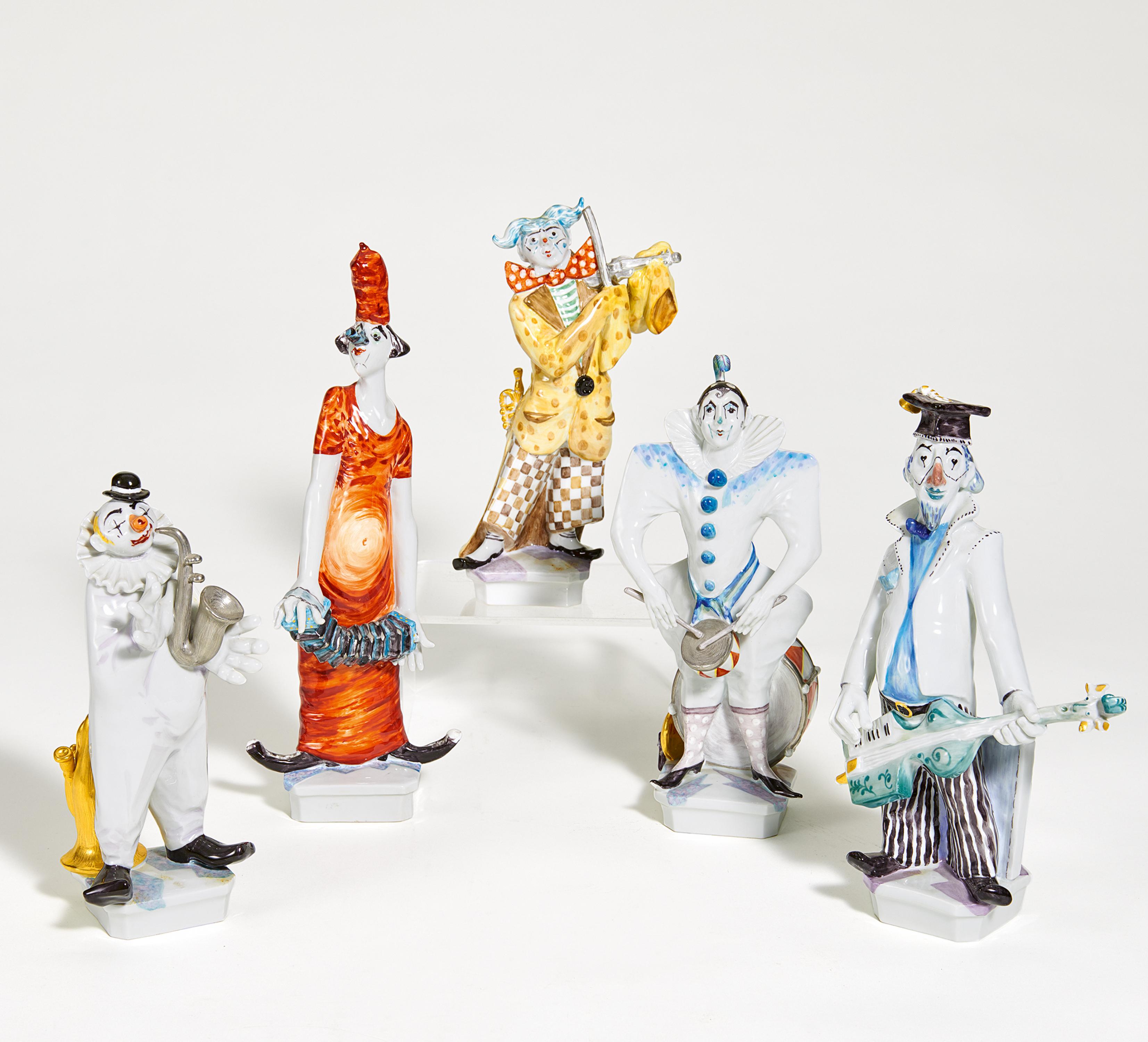 Beschreibung: Fünf Figuren aus der großen Clownkapelle: Trommler, Clown mit Ziehharmonika, Saxophonist,