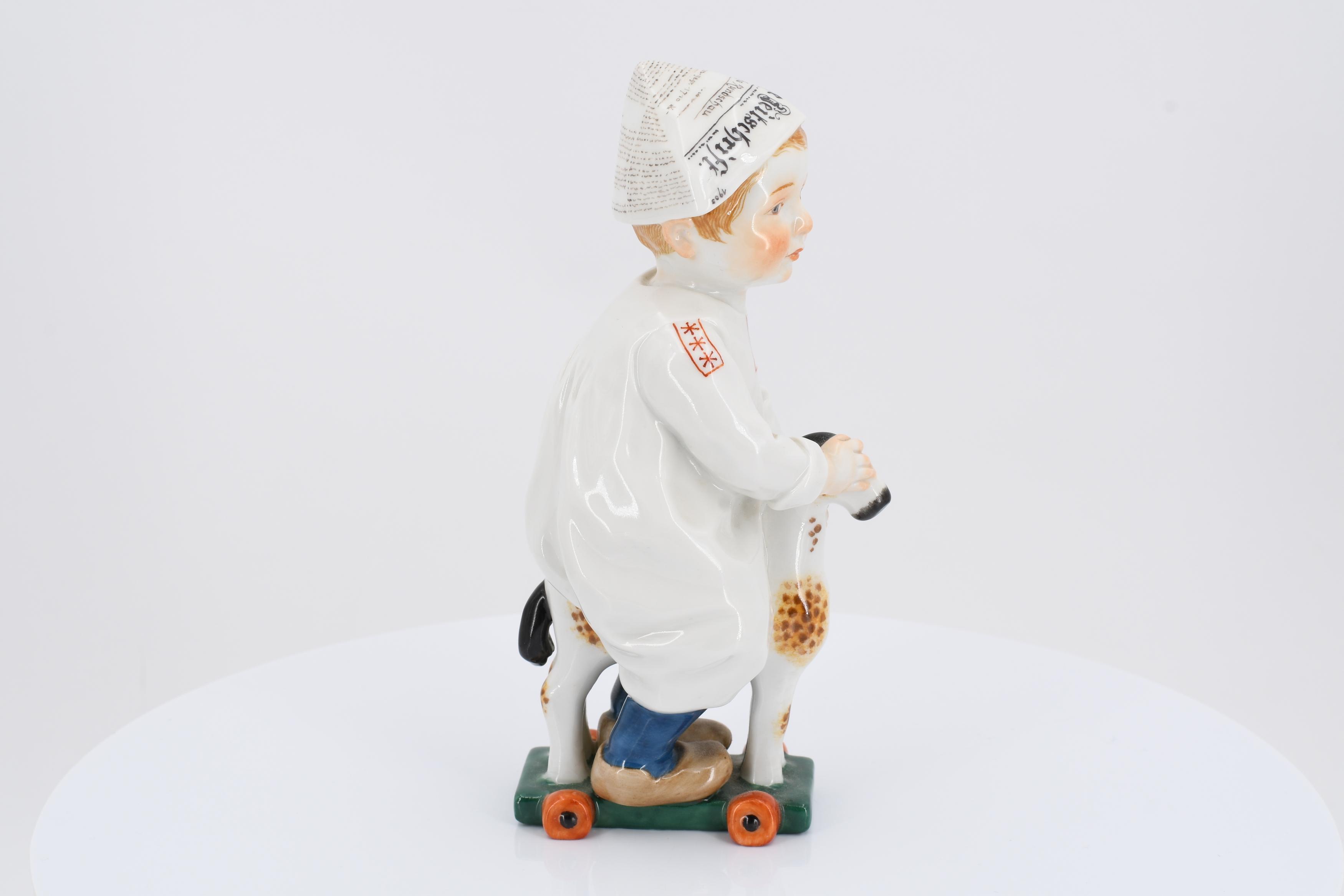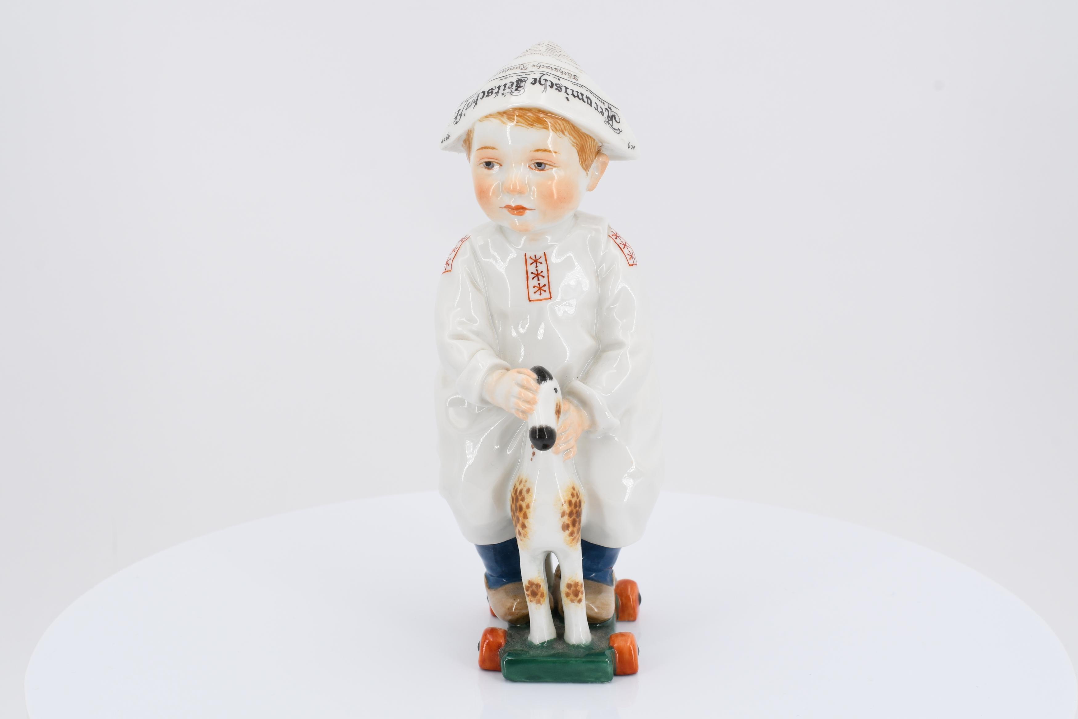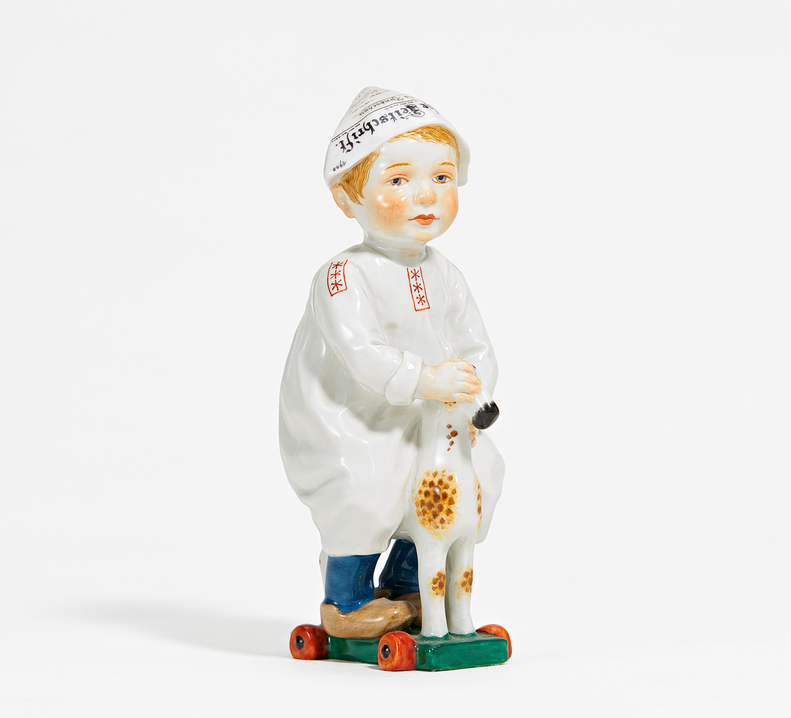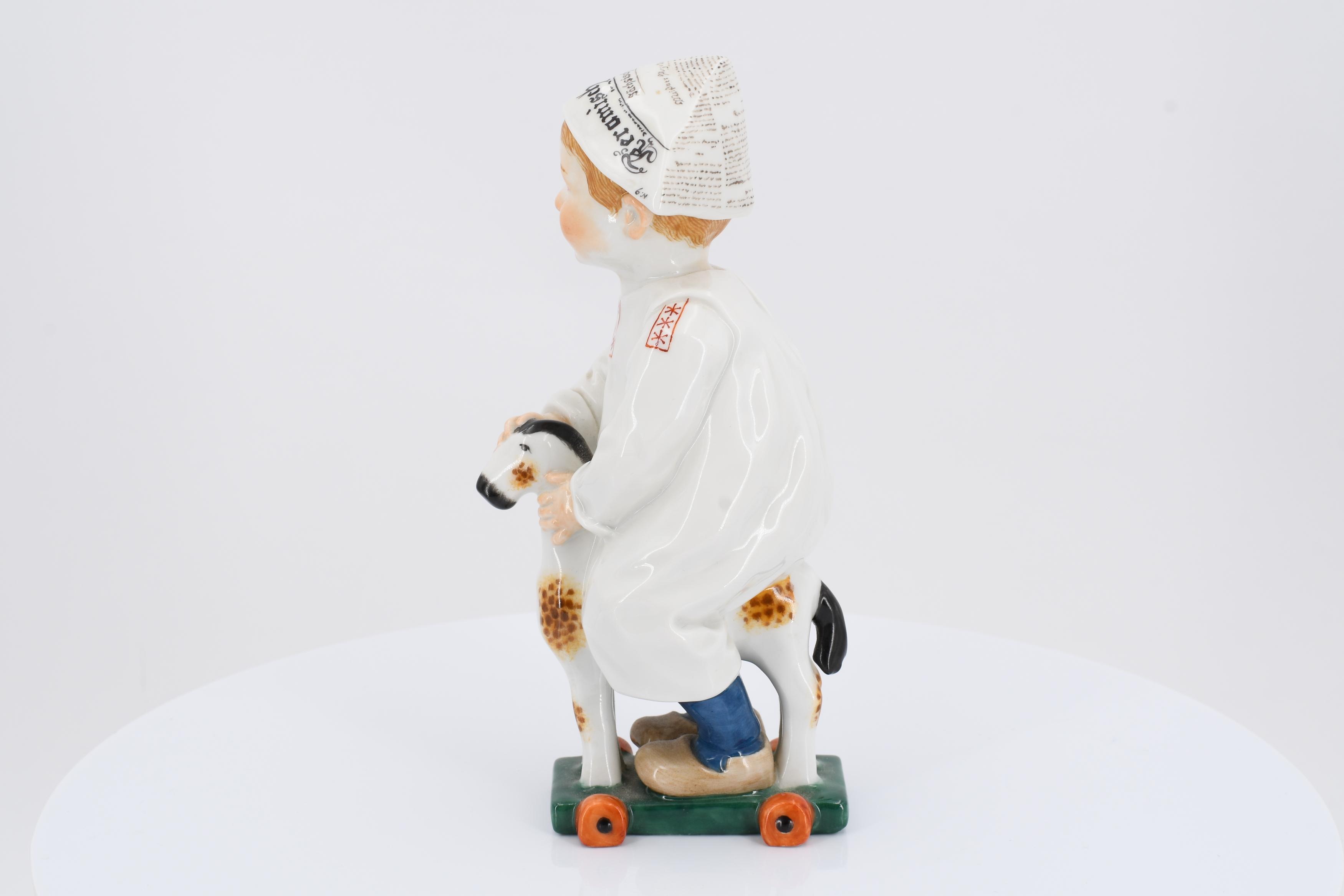 JUNGE AUF EINEM HOLZPFERD REITEND.