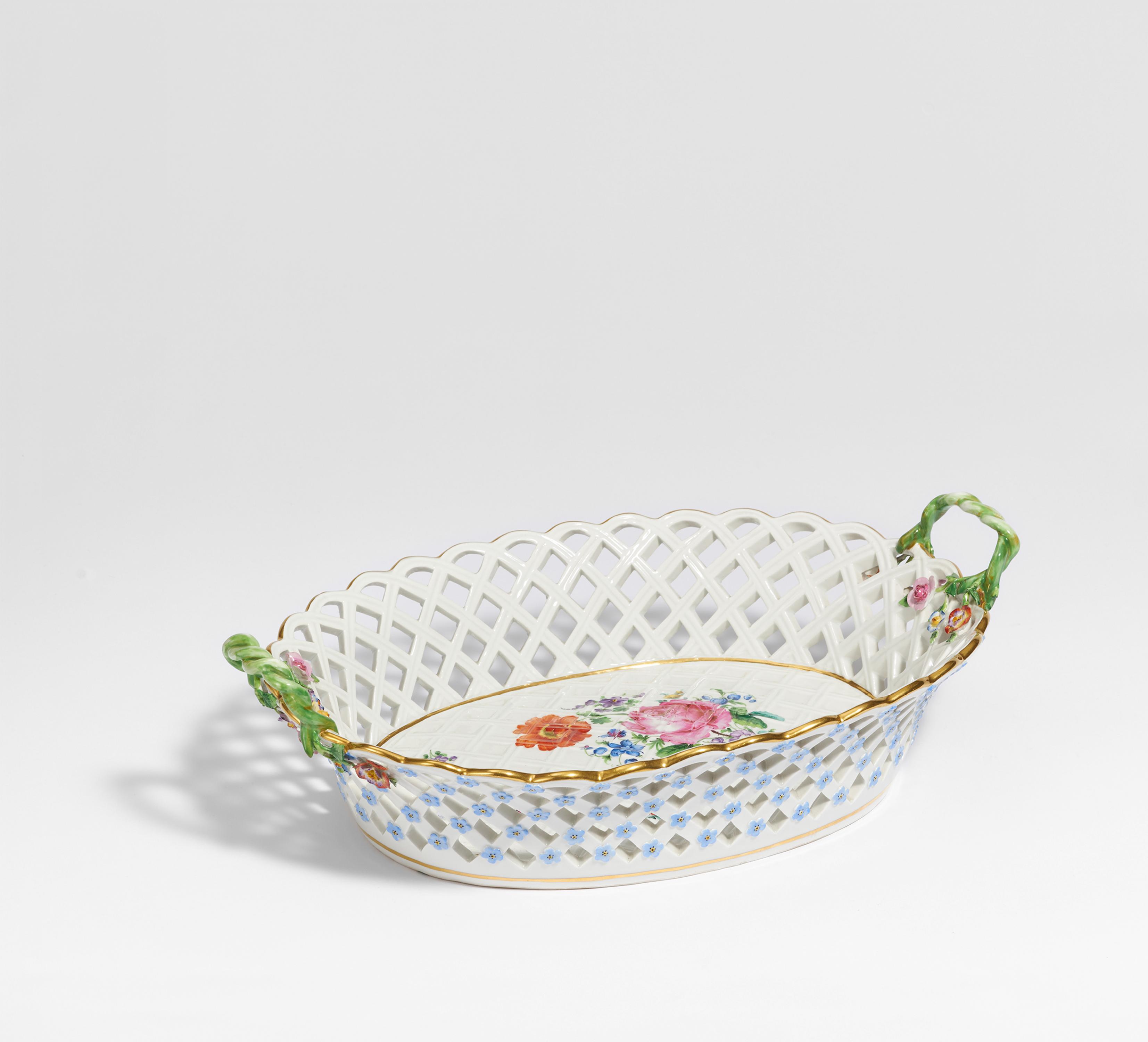 GROßER KORB MIT VERGISSMEINNICHTZIER UND BLUMENDEKOR.
