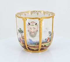 Beschreibung: Zylinderform mit passigem Rand und feiner Goldspitzenbordüre im Innern. Auf der Wandung