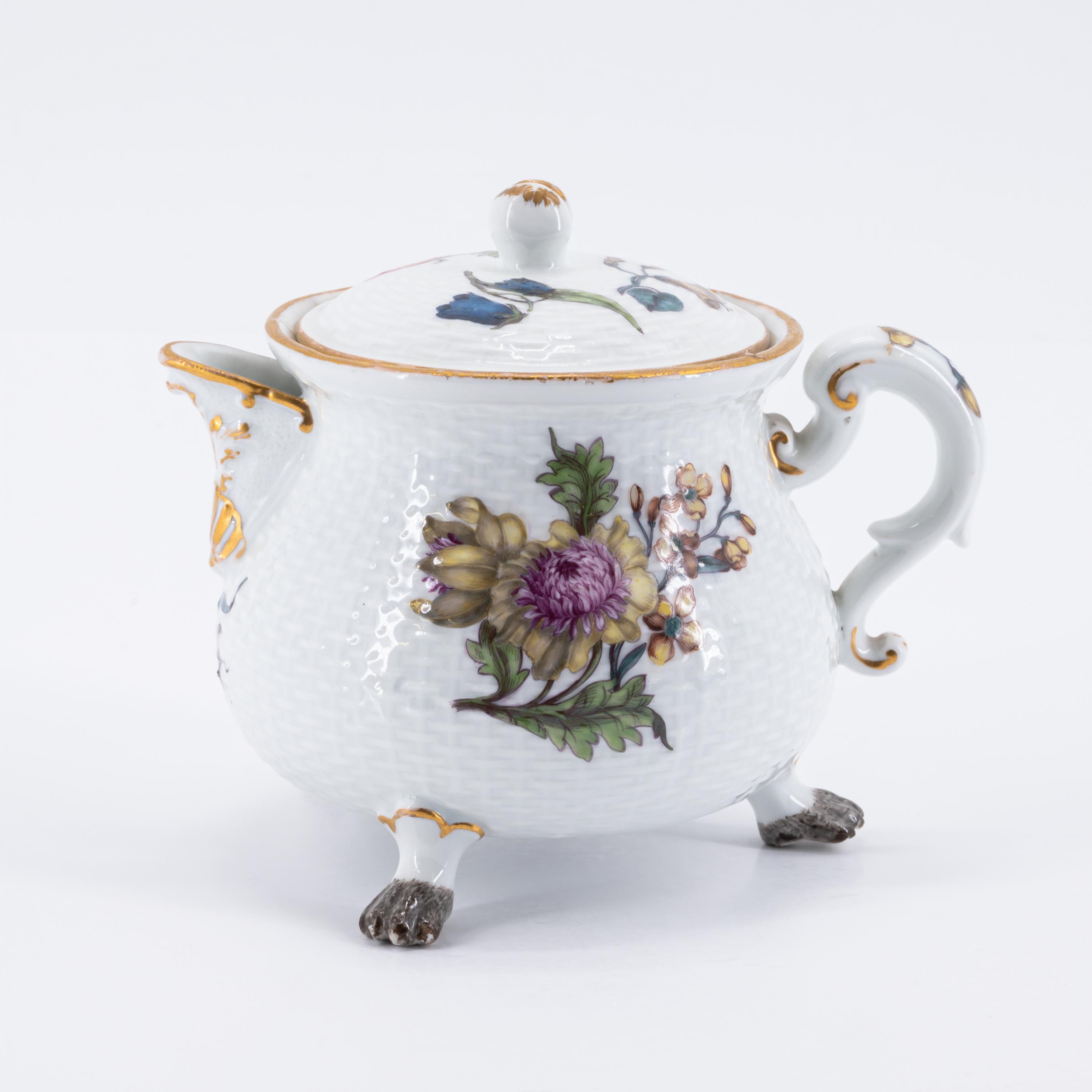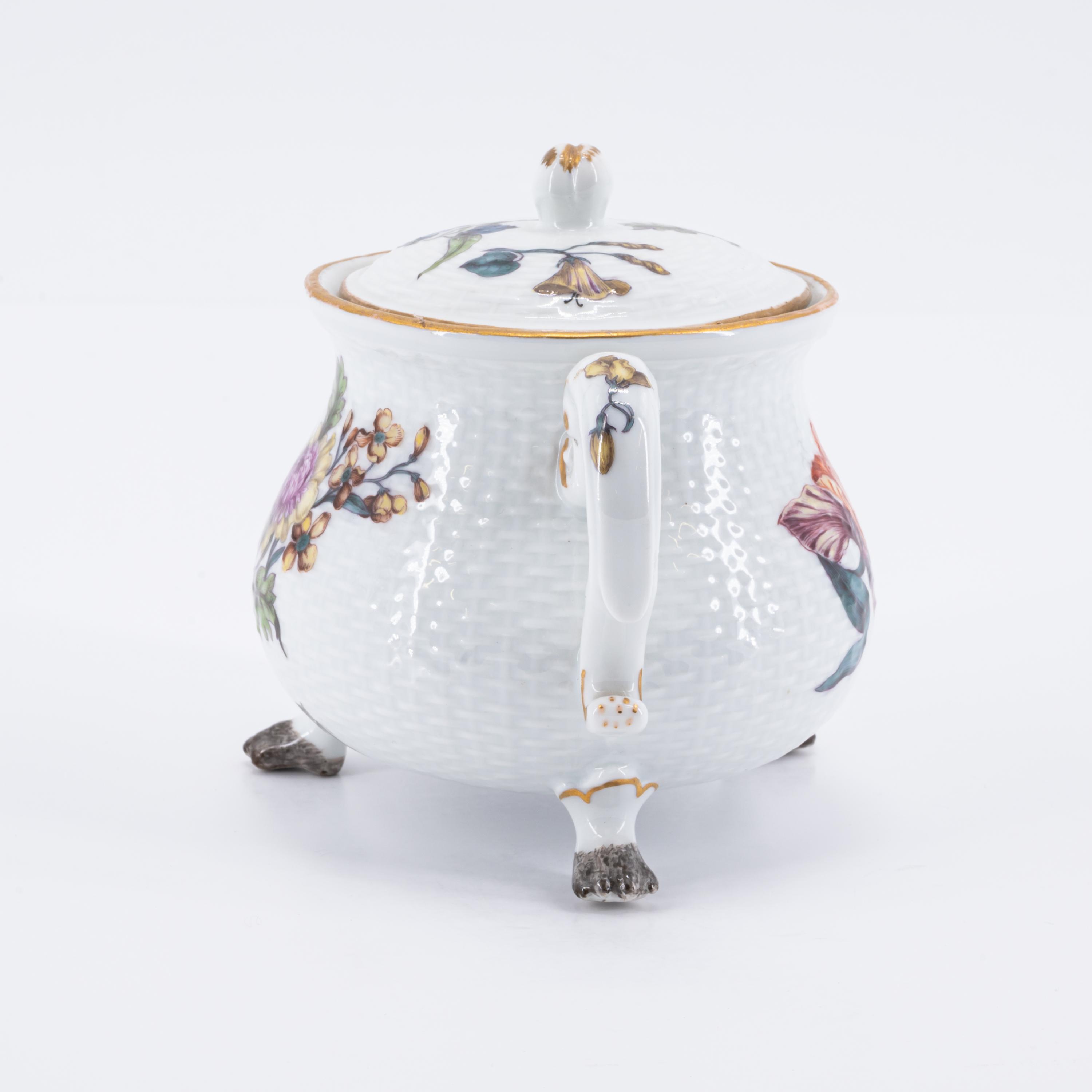 CREMETOPF MIT FEINEN HOLZSCHNITTBLUMEN.