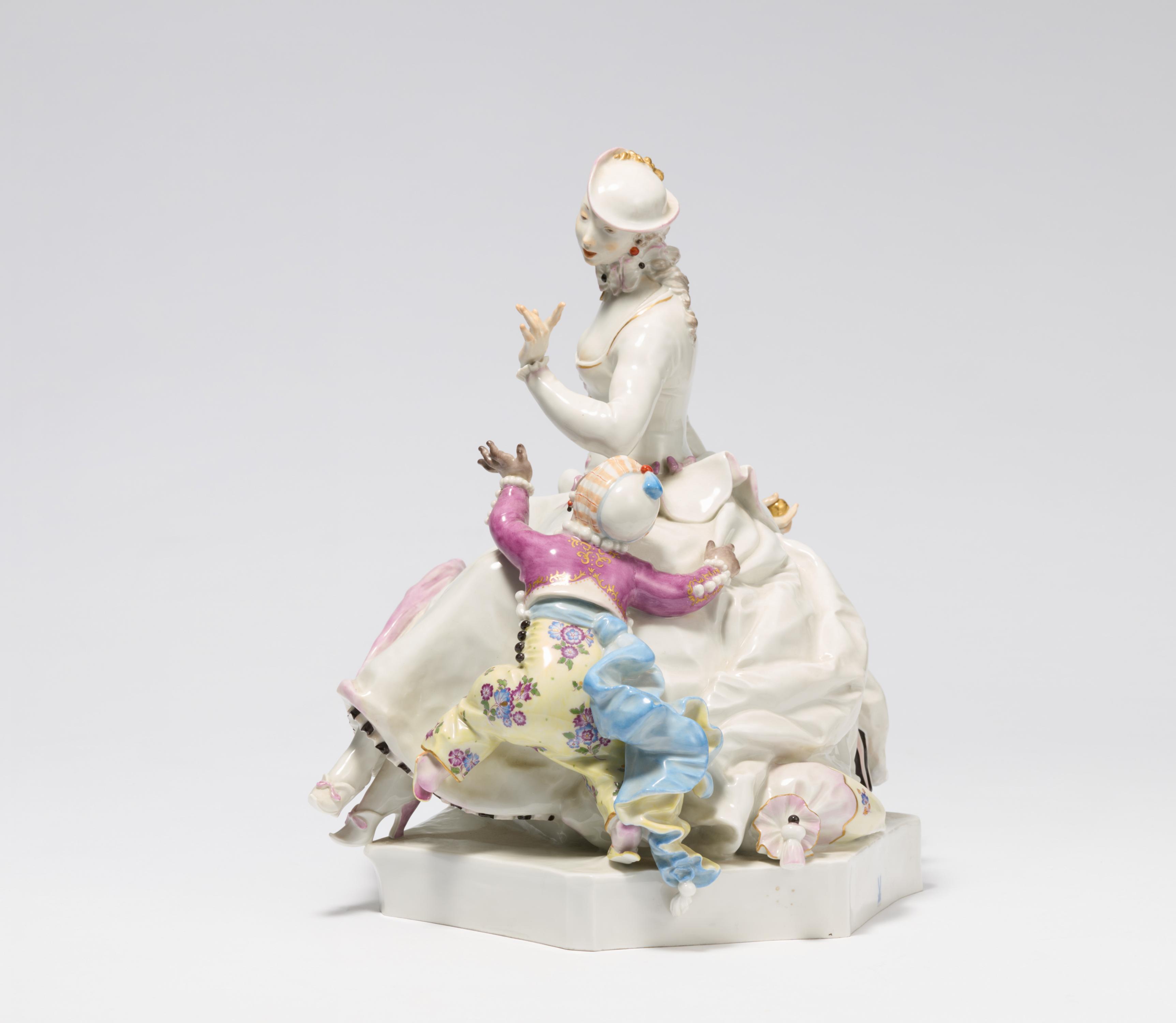 Beschreibung: Elegante Dame in weit ausladendem Kleid einen Mohrenknaben ermahnend, welcher sich die