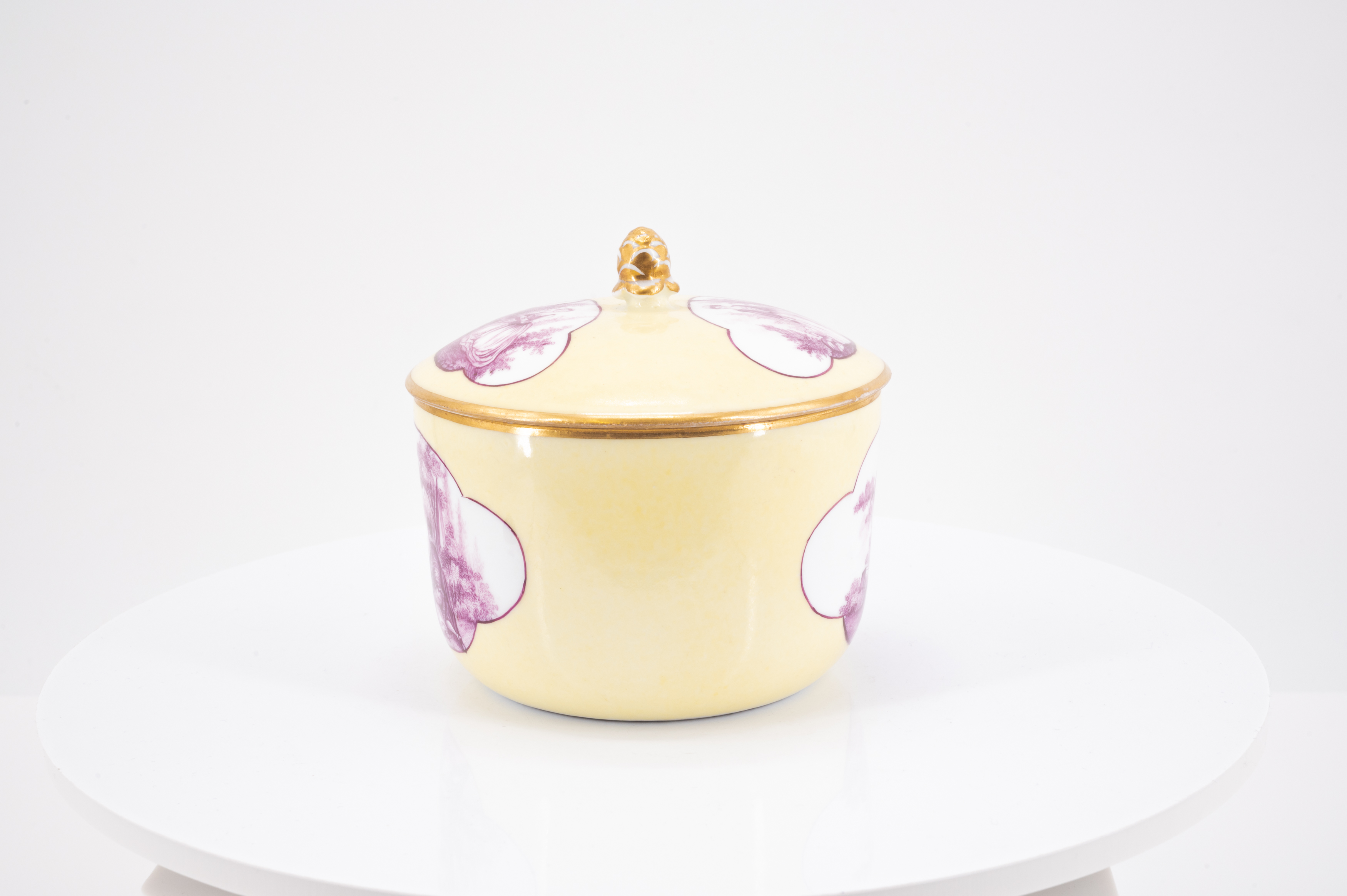 Technik: Porzellan, gelber Fond, Purpurdekor.