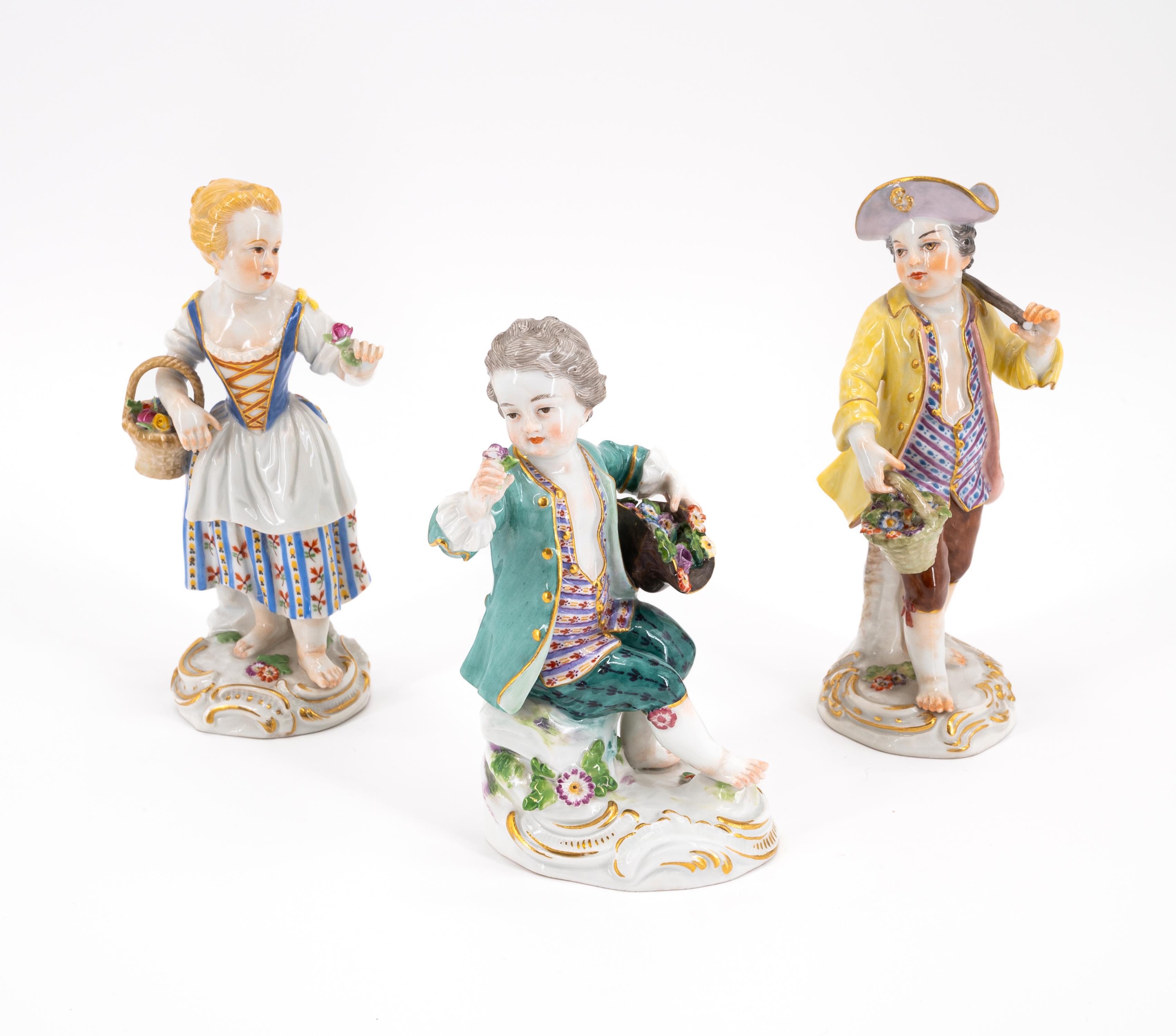 DREI BLUMEN SAMMELNDE KINDERFIGUREN AUF ROCAILLE-SOCKELN.