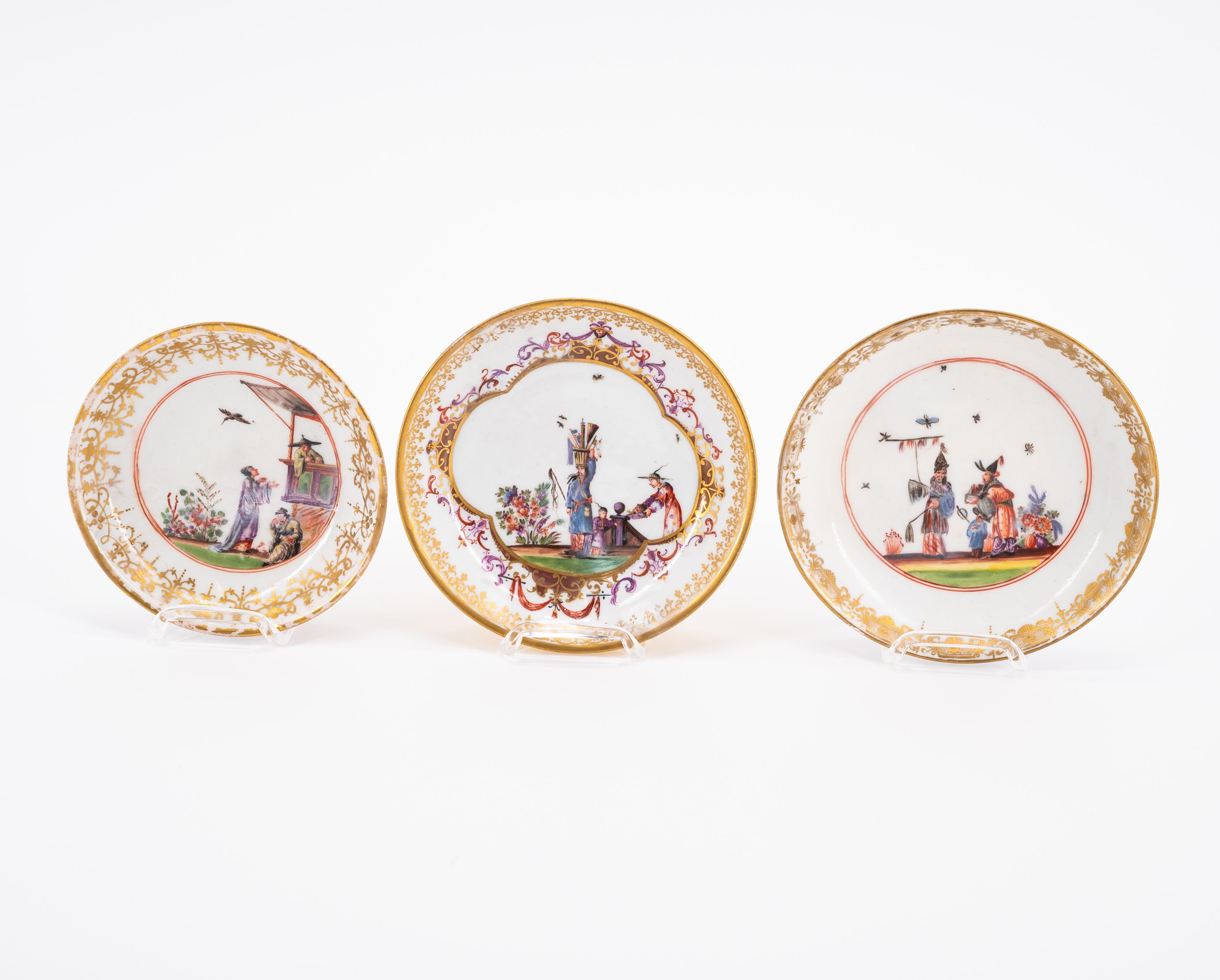 DREI TELLER MIT CHINOISERIEN, EIN KÄNNCHEN & TELLER MIT AUFGELEGTEN BLÜTEN.