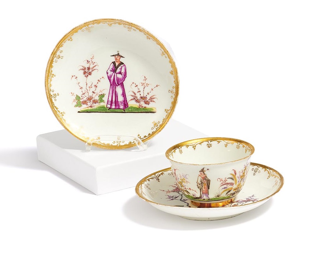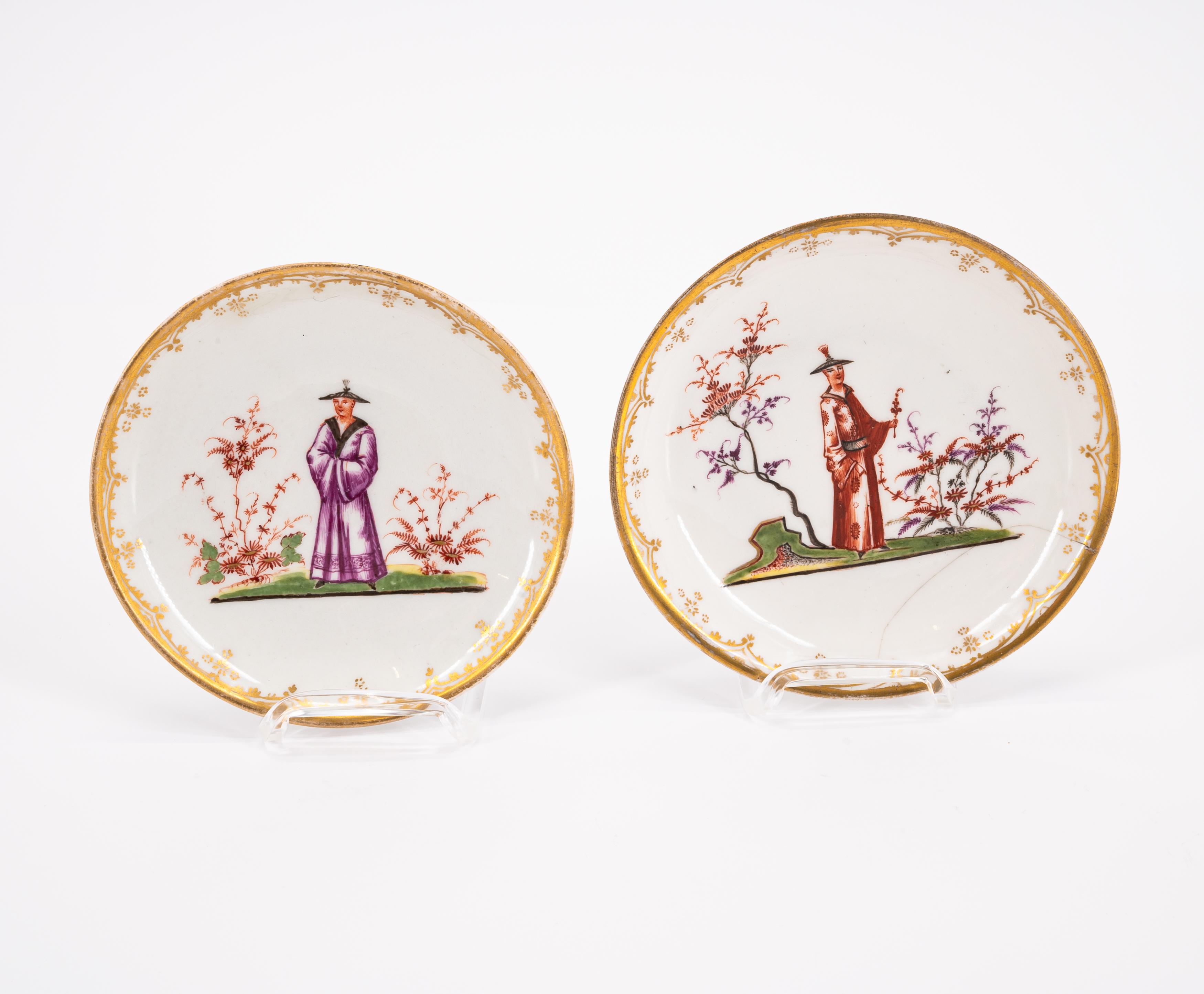 EIN KOPPCHEN UND ZWEI UNTERTASSEN MIT CHINOISERIEN.