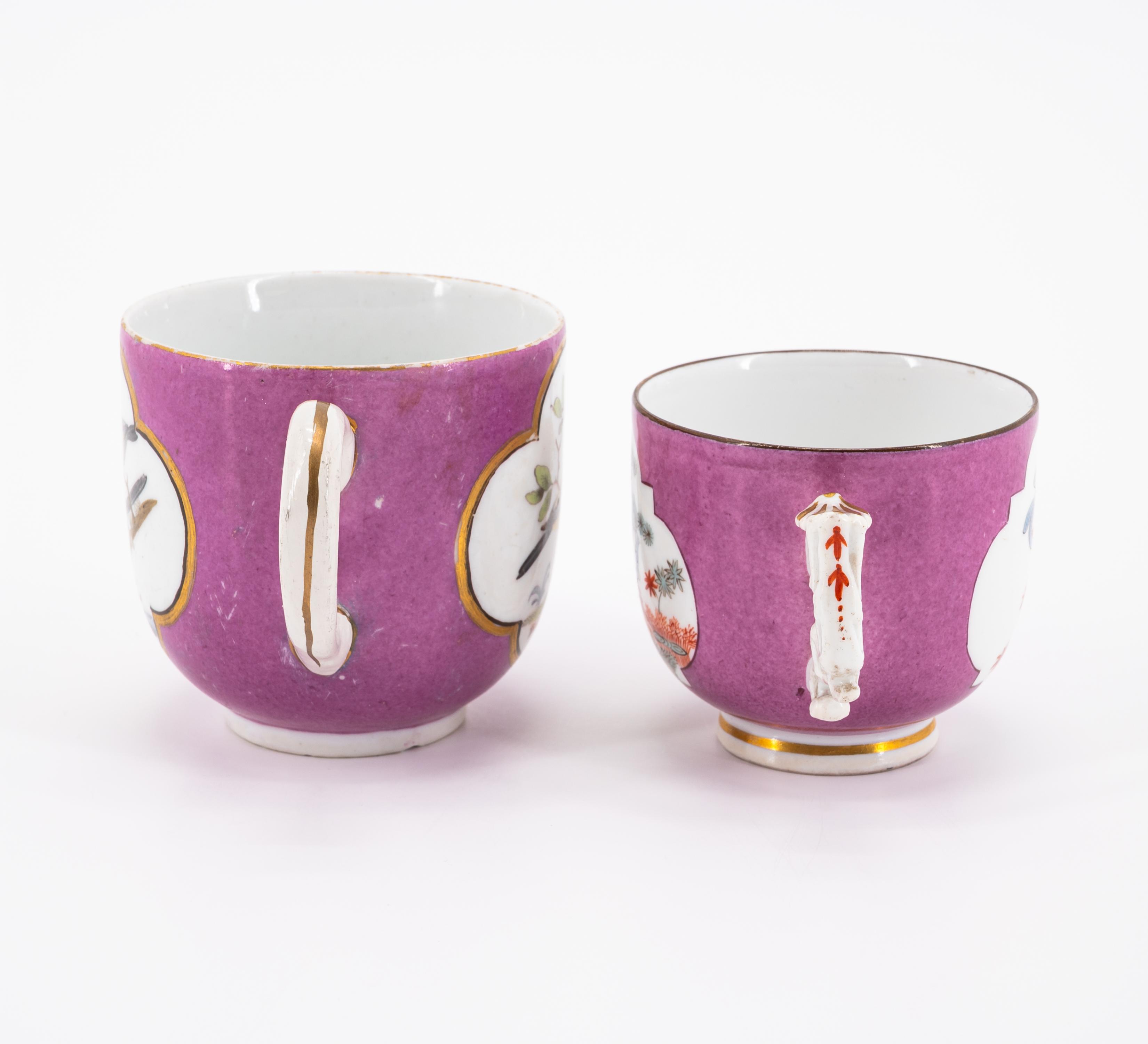 EINE TASSE UND UNTERTASSE MIT WACHTELDEKOR & ZWEI TASSEN MIT PURPURFOND UND VOGELDEKOREN.