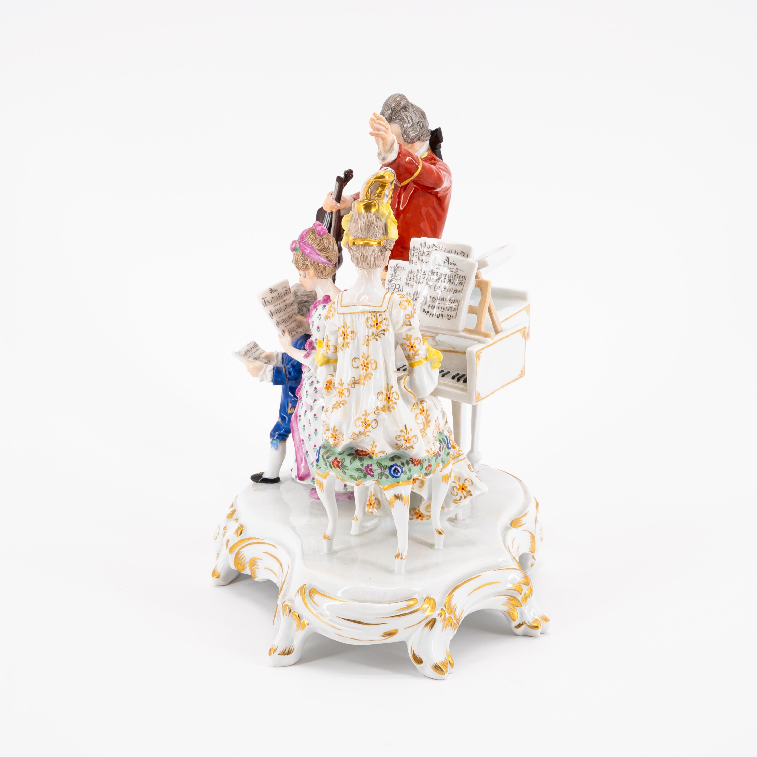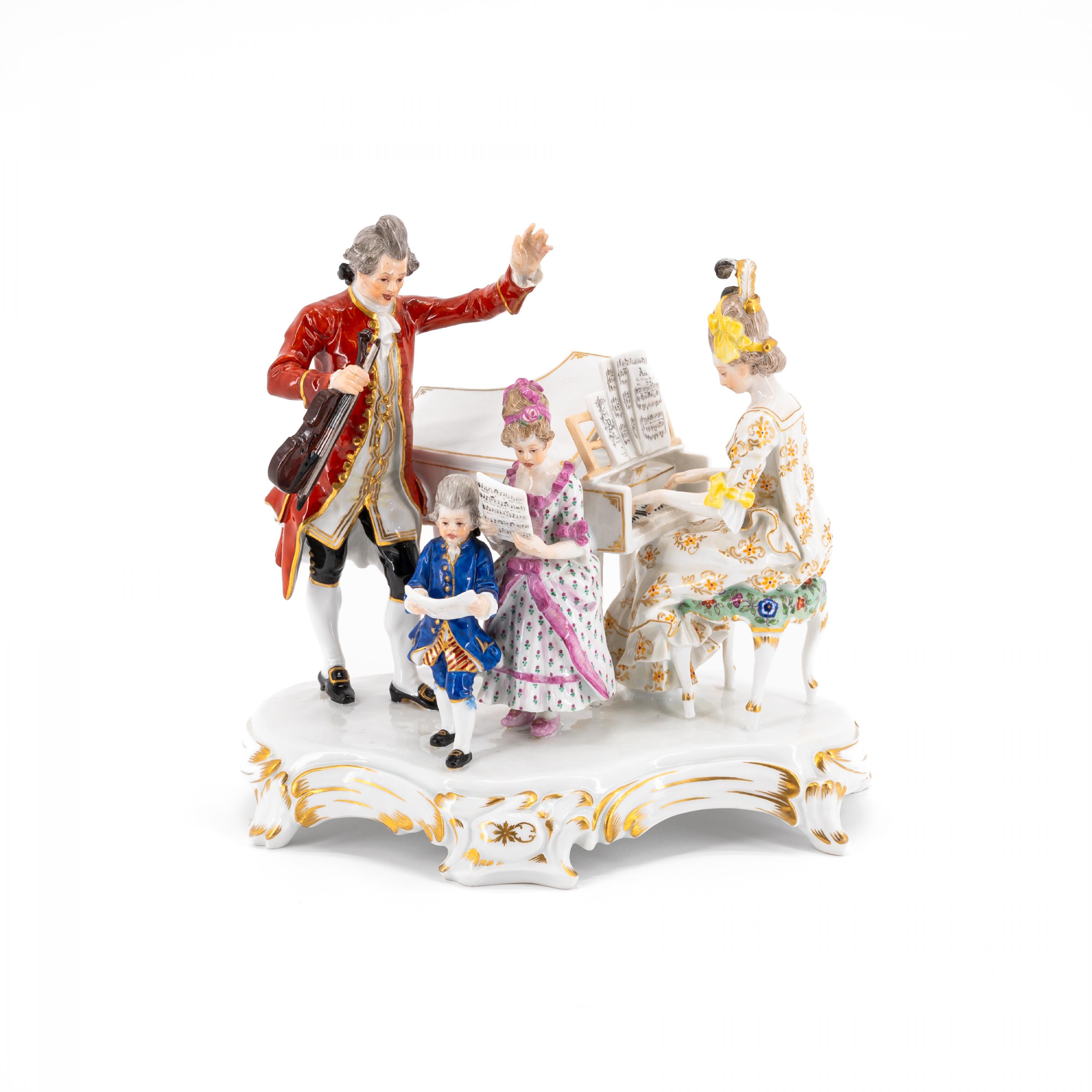 Beschreibung: Auf Rocaillesockel, um ein Klavier eine Familie versammelt. Der Vater dirigierend und in