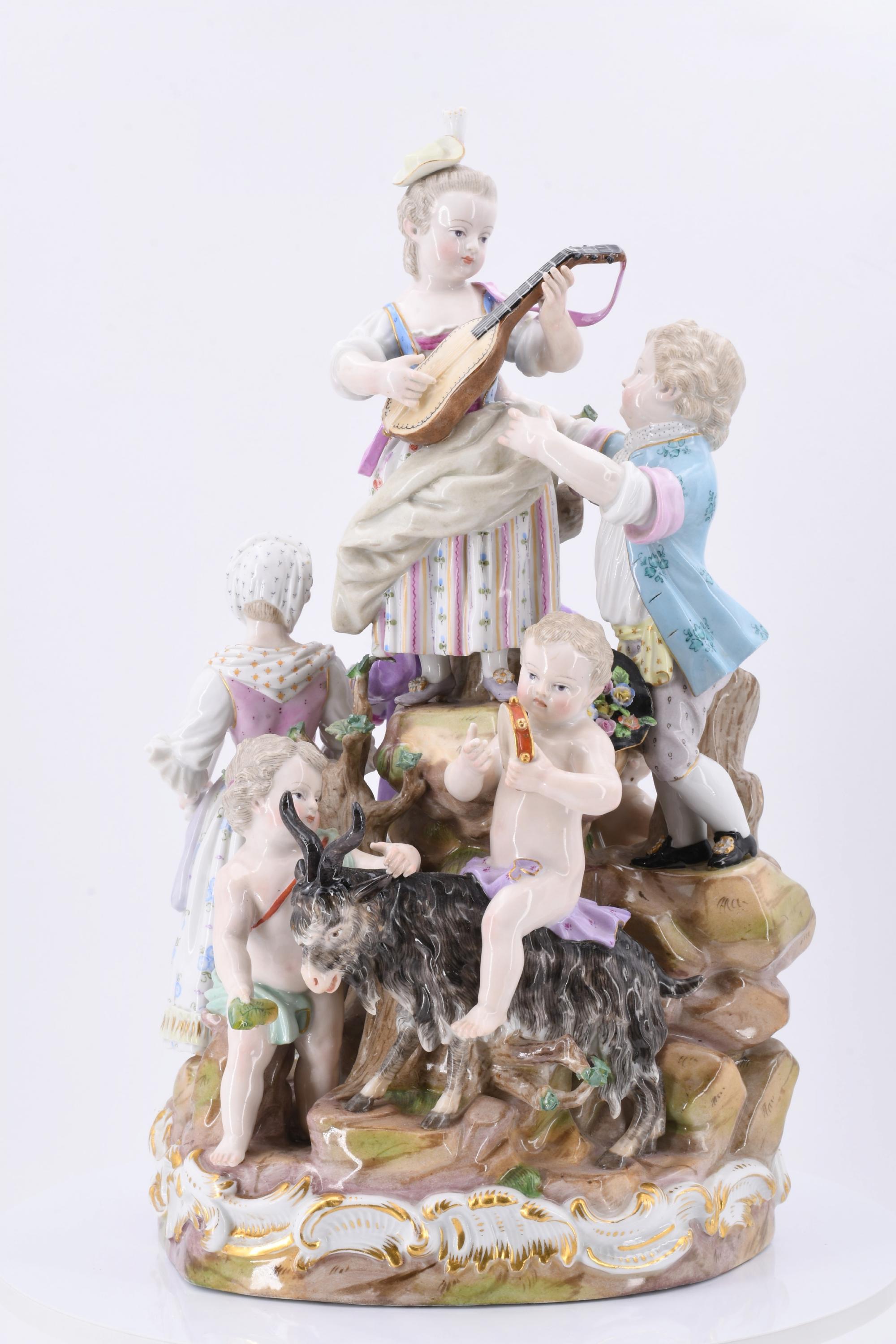 Beschreibung: Auf einem mit Rocaillen verzierten, ovalen Felssockel eine Gruppe musizierender Kinder mit