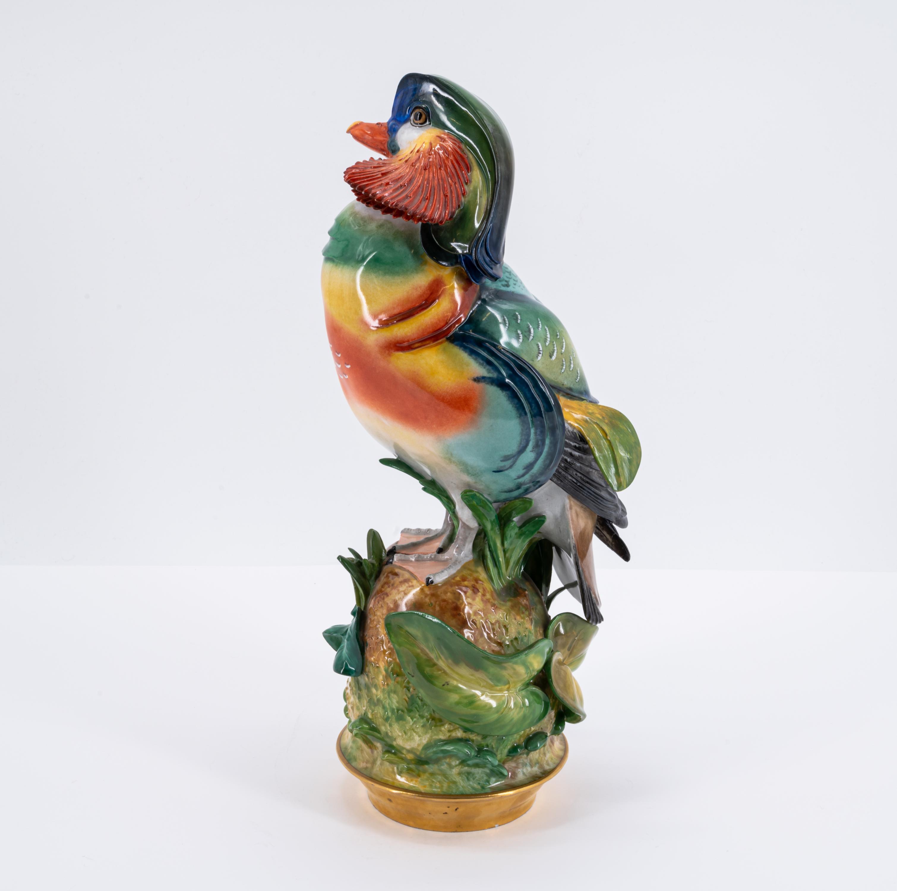 Beschreibung: Mandarinente auf hohem, mit Seerosenblättern und Schilf bewachsenem Sockel.