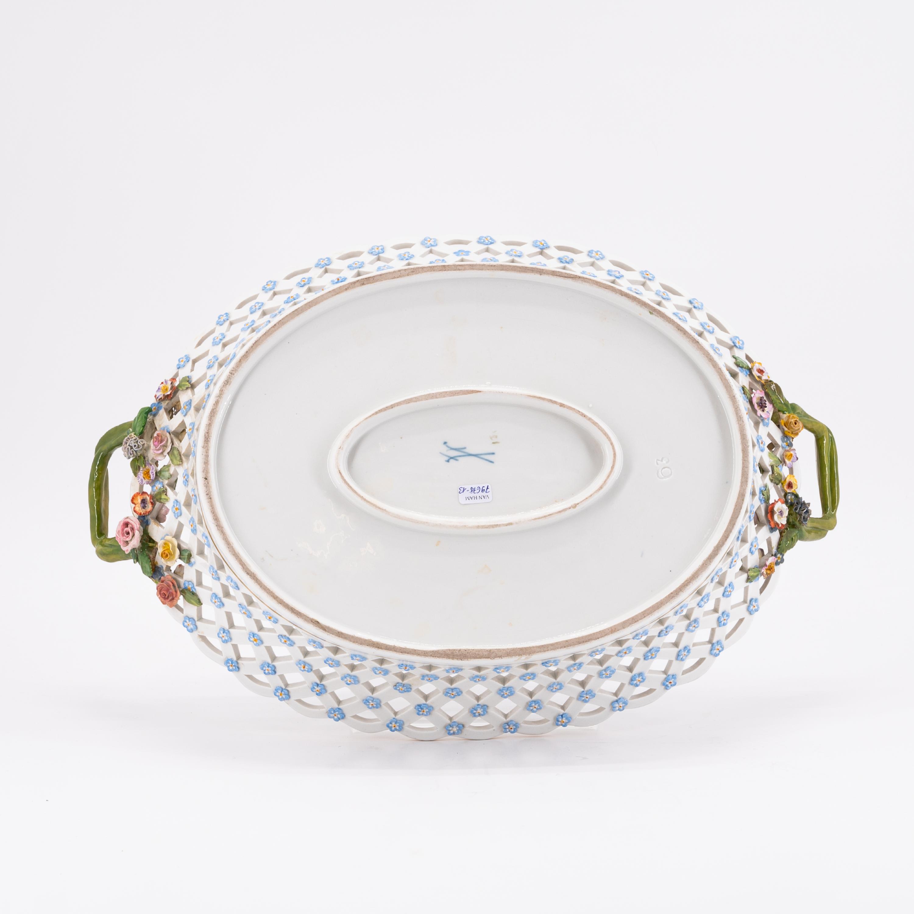 GROßER KORB MIT AUFGELEGTEN BLÜTEN UND RANKENHENKELN.