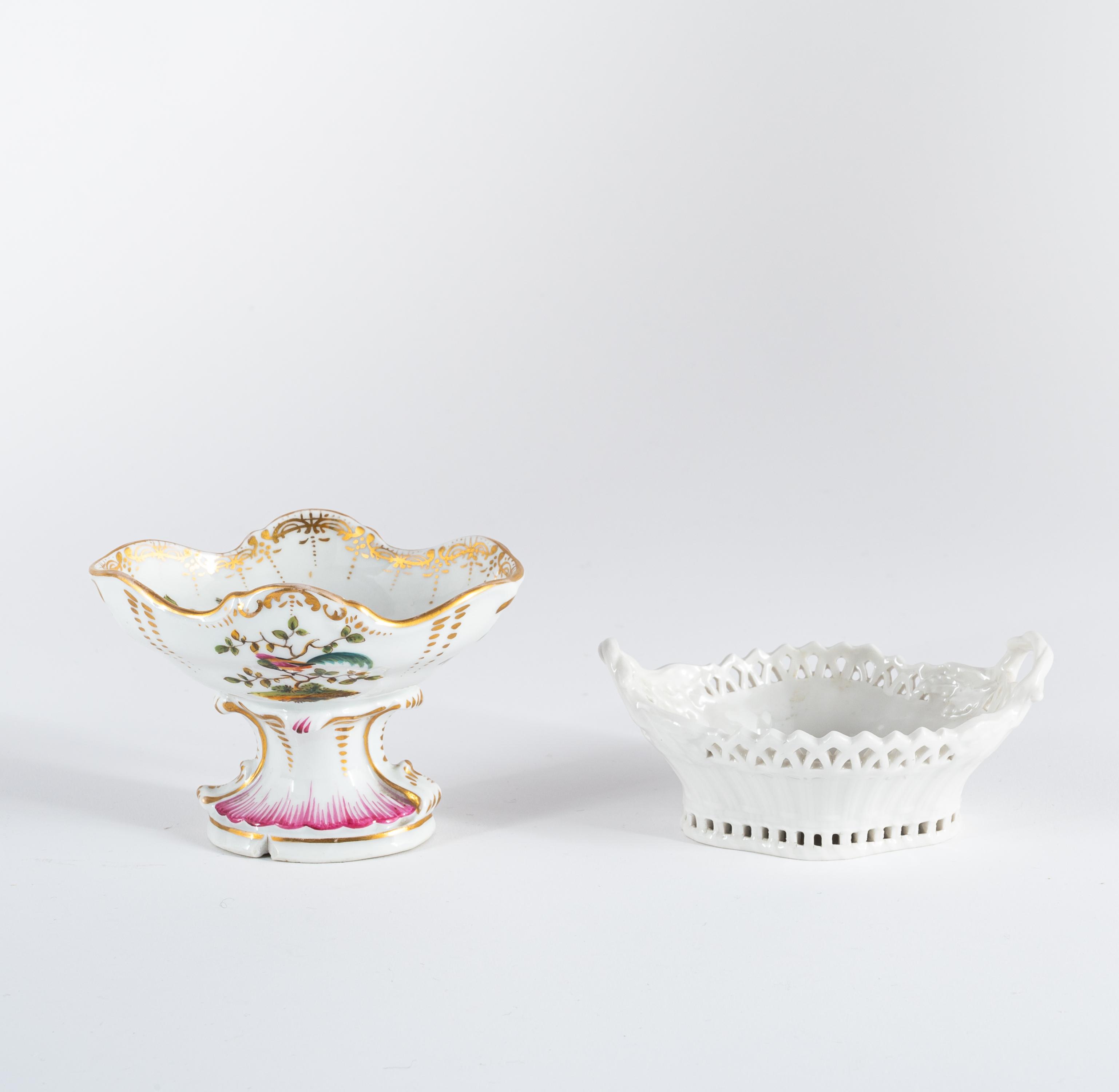 Technik: Porzellan, farbig staffiert. 2 Teile mit Metallmontierung.