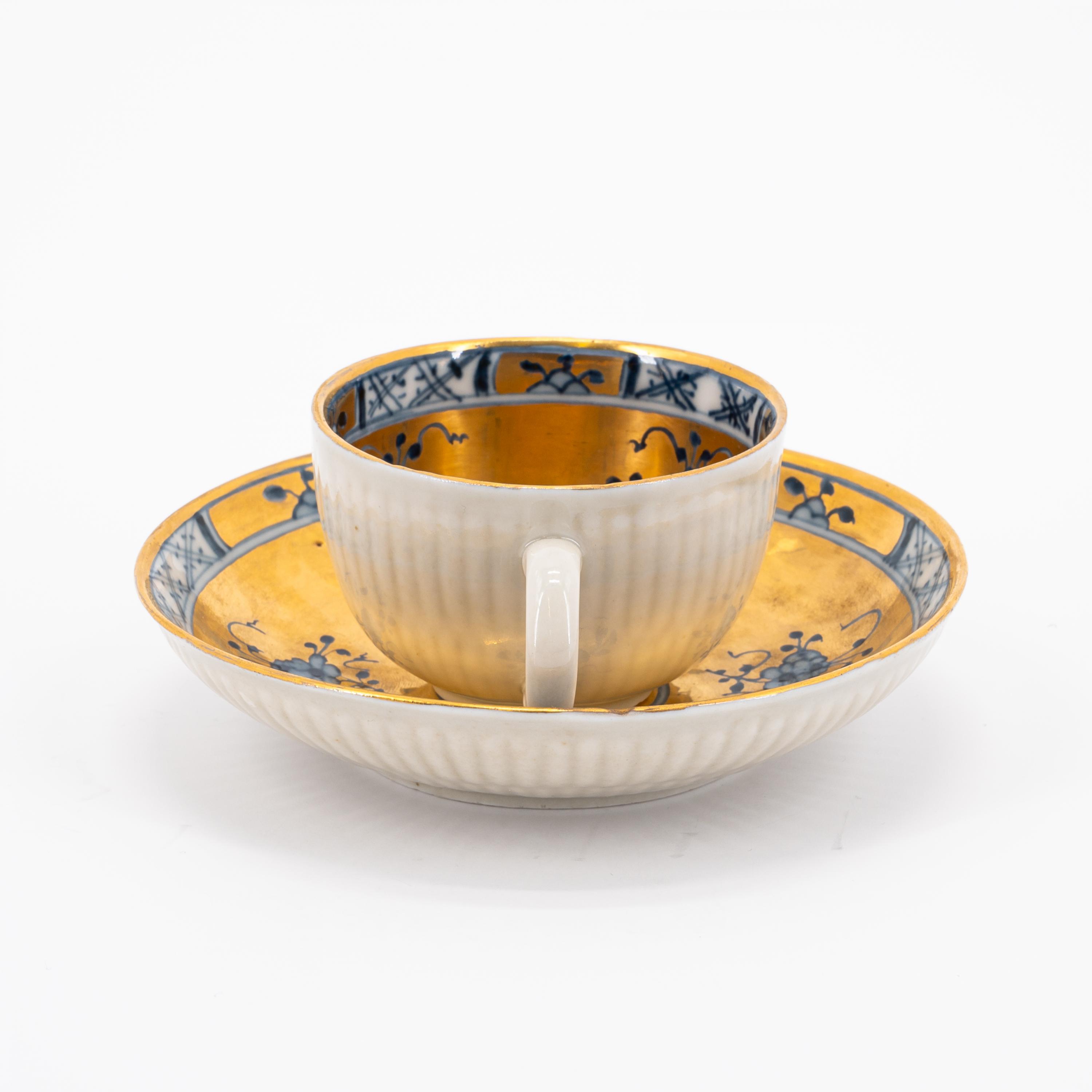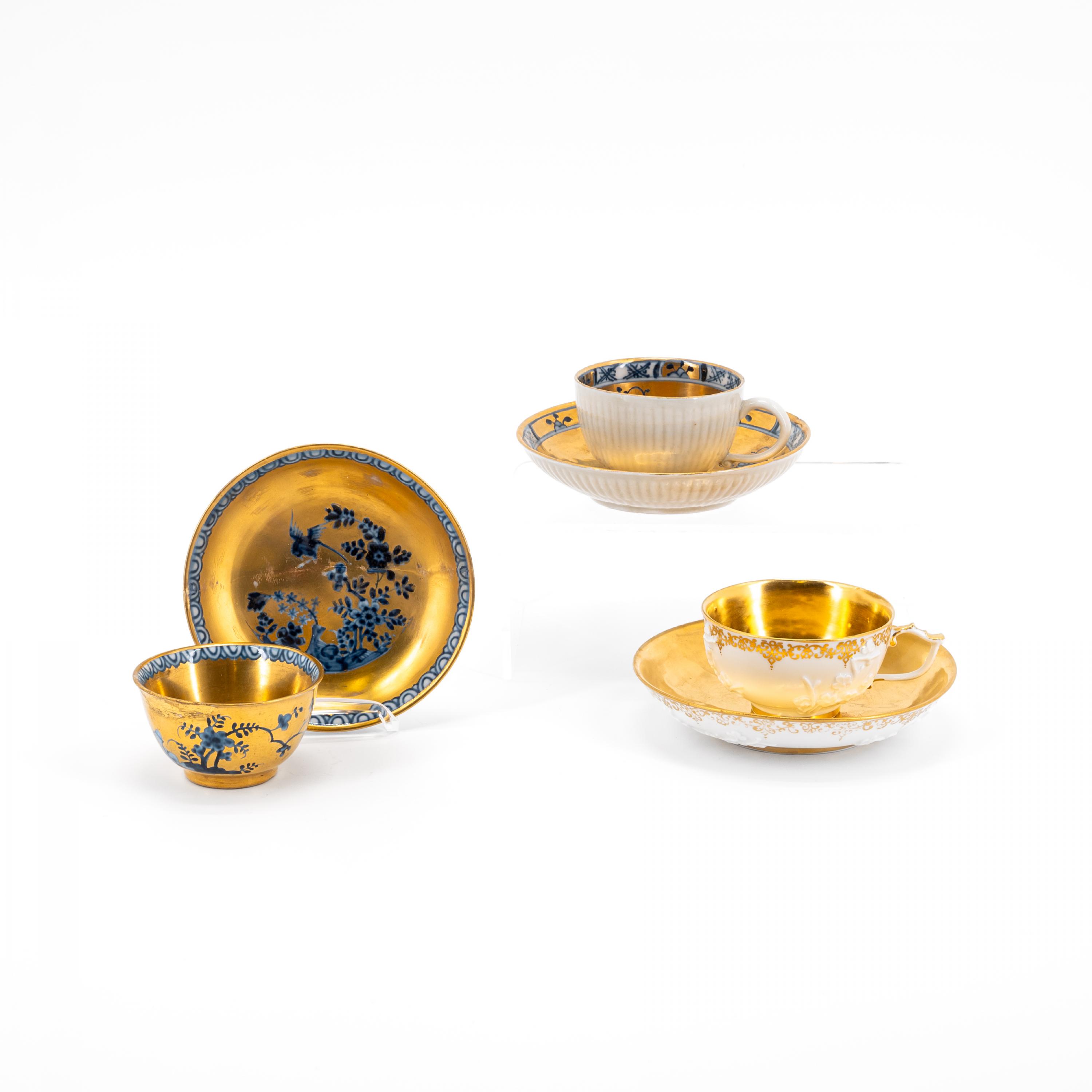 Technik: Porzellan, 2x mit unterglasurblauem Dekor. Alle Teile mit Vergoldung.