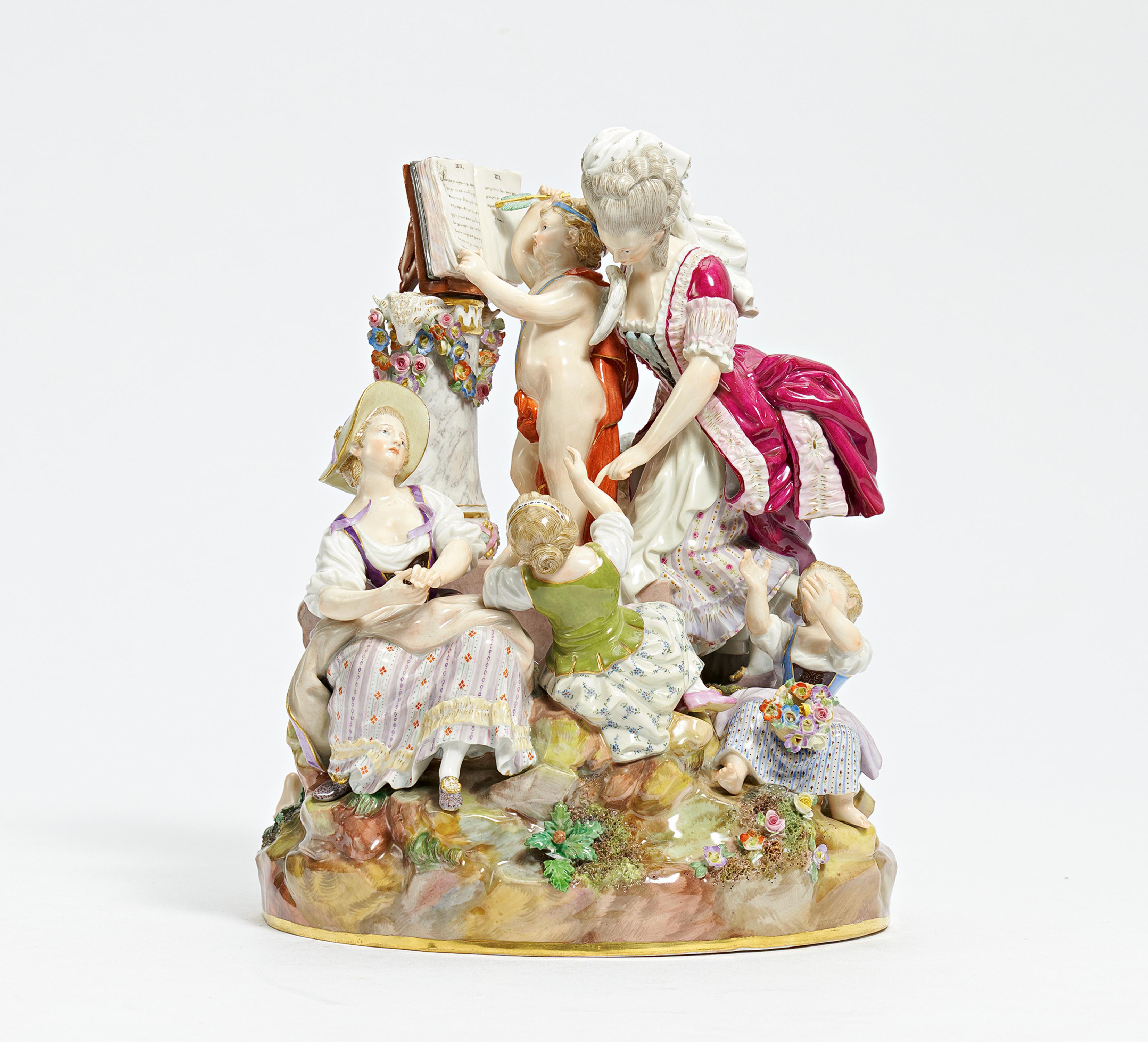 Beschreibung: Auf Felssockel vier höfische Damen und zwei kleine Mädchen um einen in der Mitte stehenden