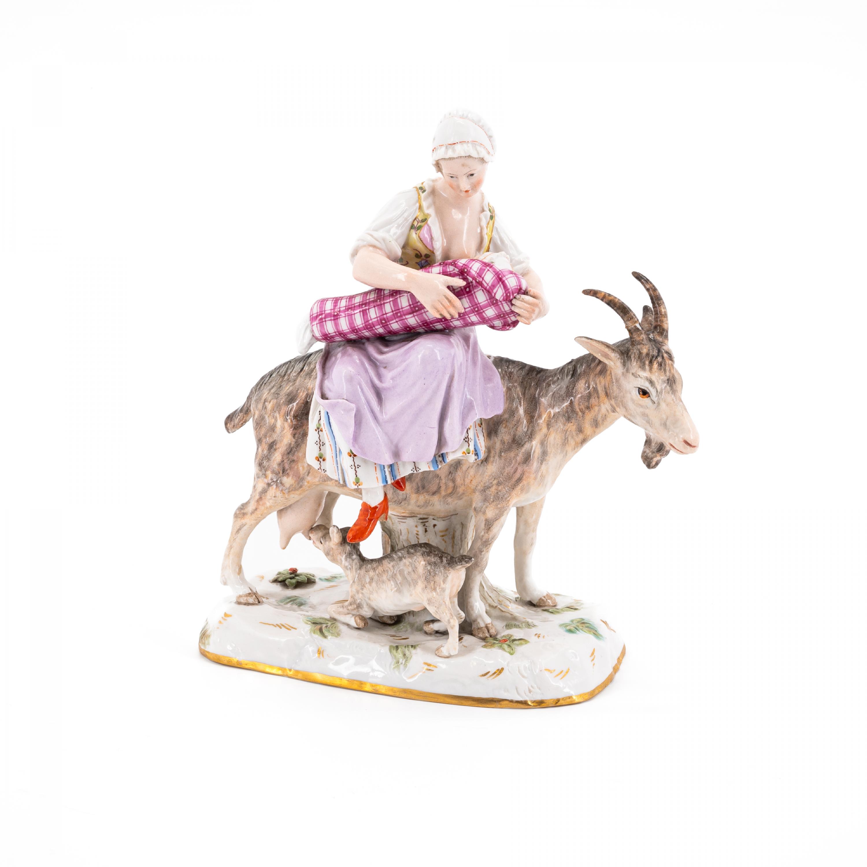 Beschreibung: Die Schneidersgattin mit geblümtem Kleid, seitlich auf einer Ziege reitend und dabei ihr
