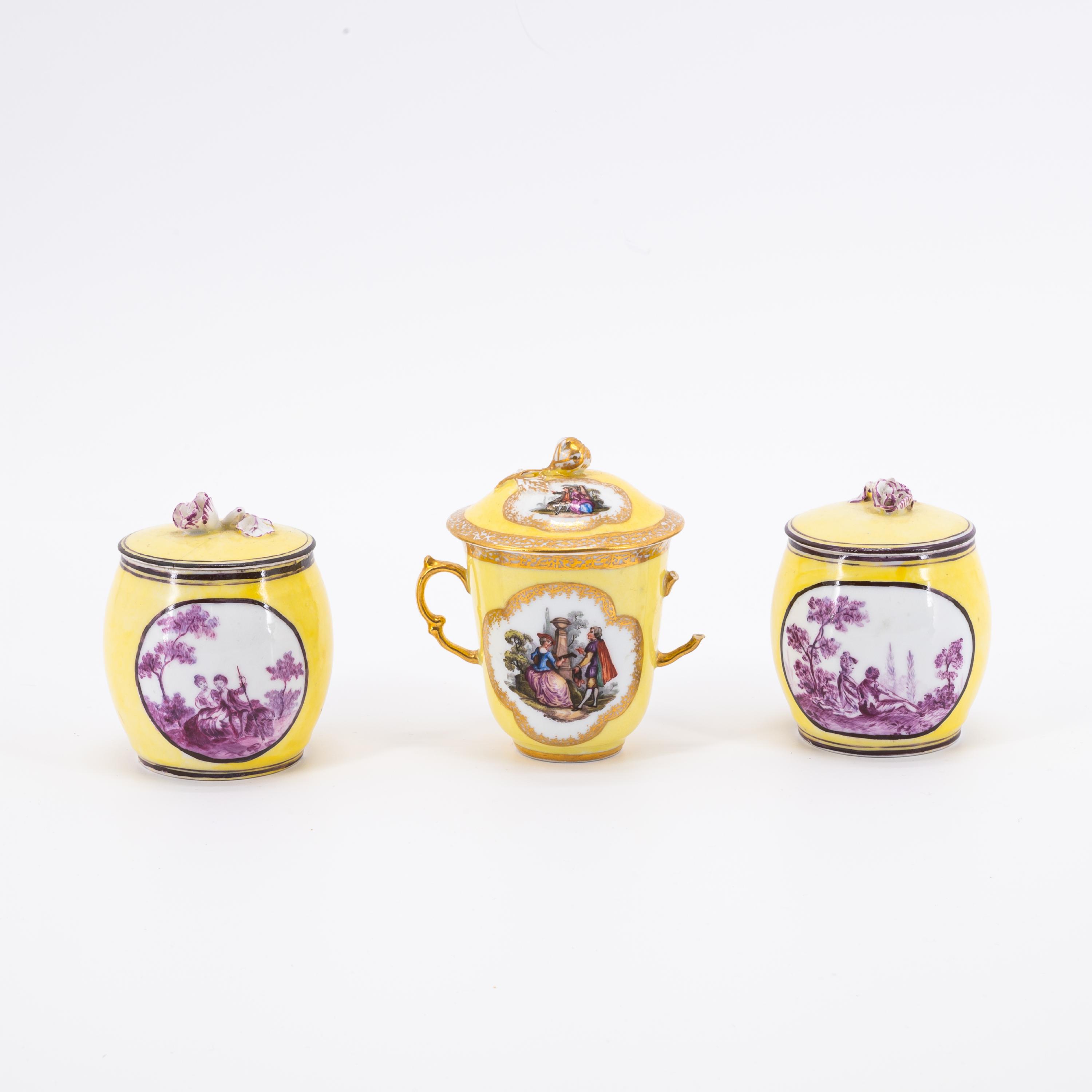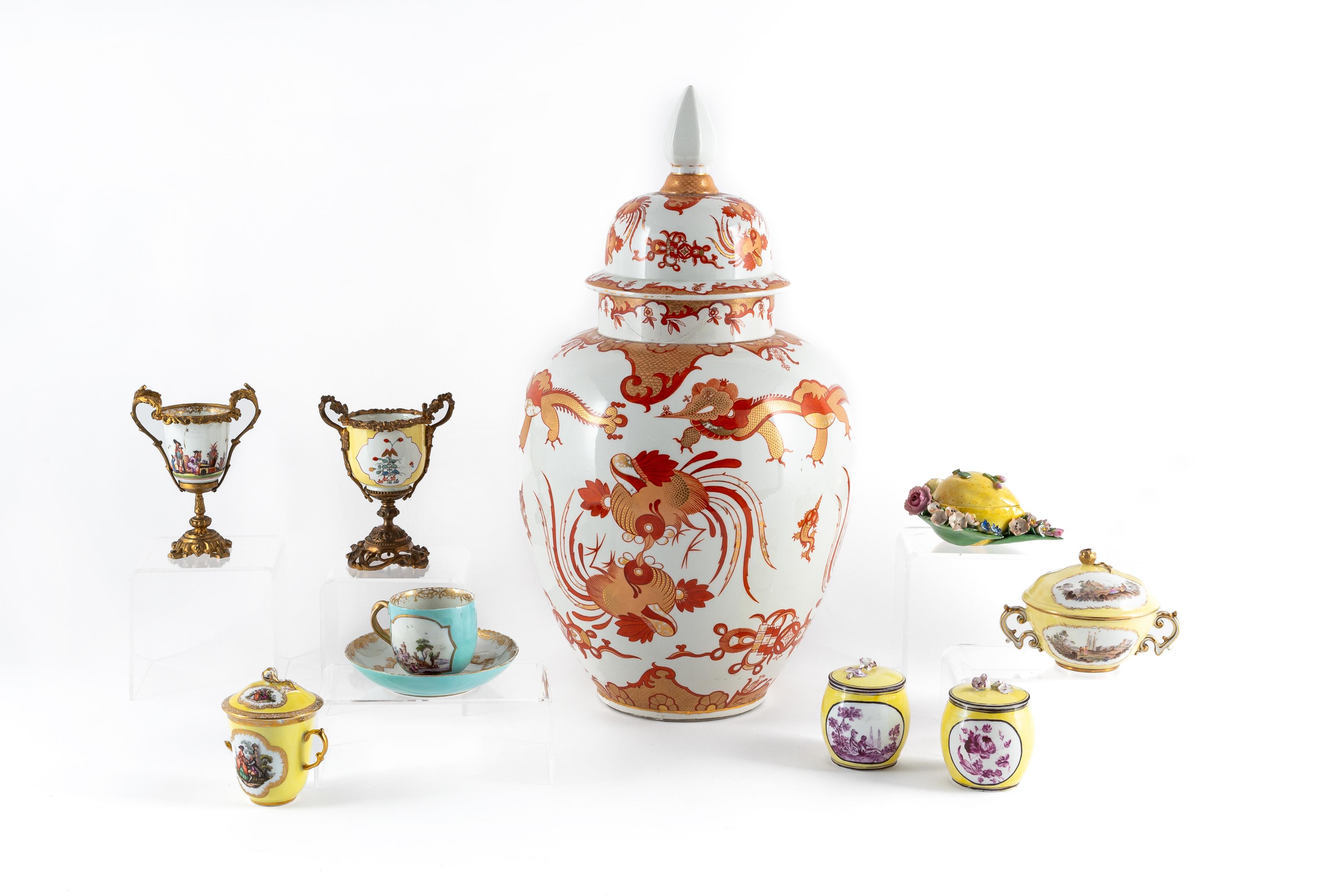 1 Großen Deckelvase Dekor Roter Drache, 5 unterschiedlichen Deckelgefäßen mit gelbem Fond, 2 kleinen Vasen mit Metallmontierungen und 1 Tasse mit Untertasse und Türkisfond.