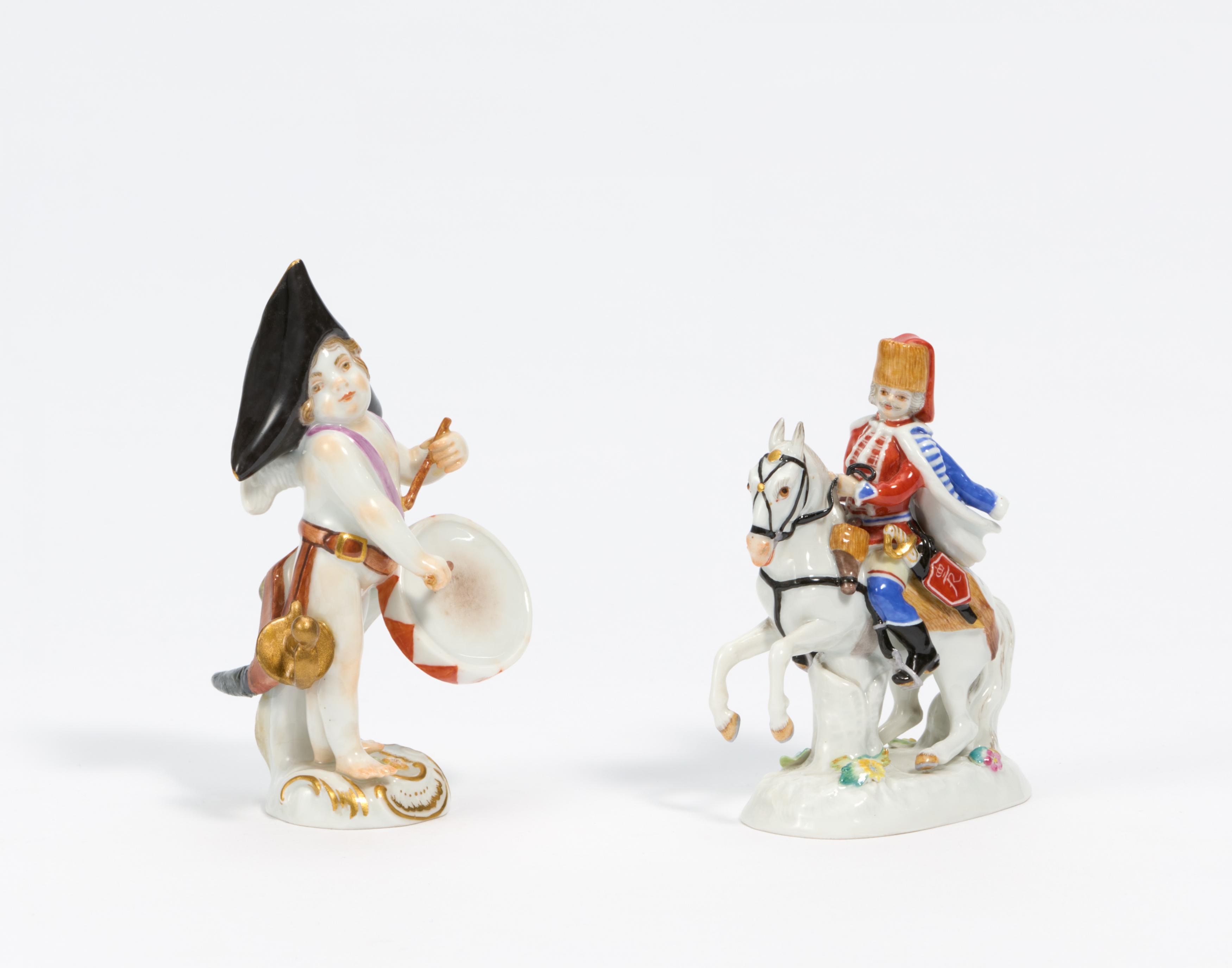 HUSAR ZU PFERD UND PUTTO ALS TROMMLER.