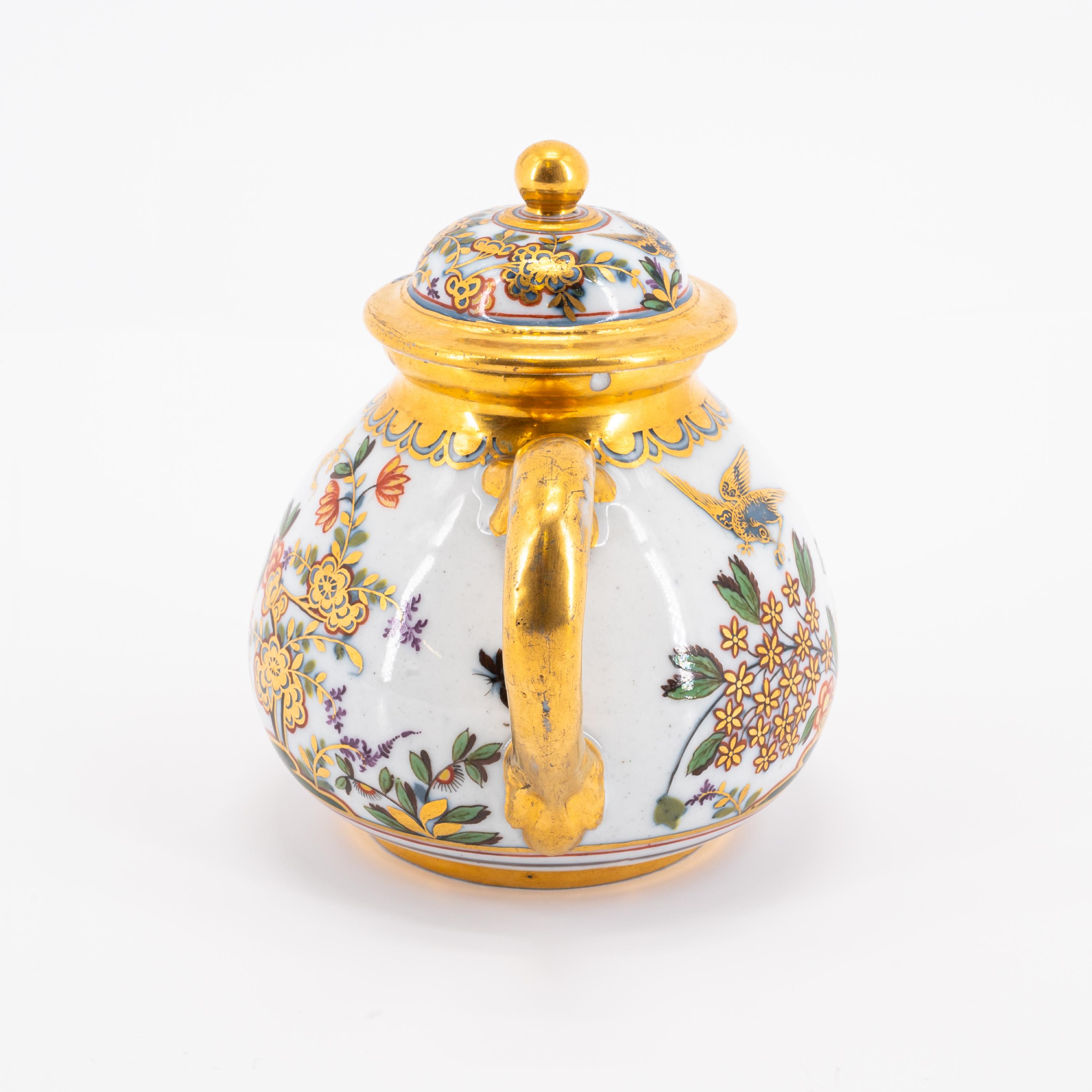 Beschreibung: Kleine Kanne mit überdekoriertem Vogel-Fels Motiv und nachvergoldetem Henkel und Hals,