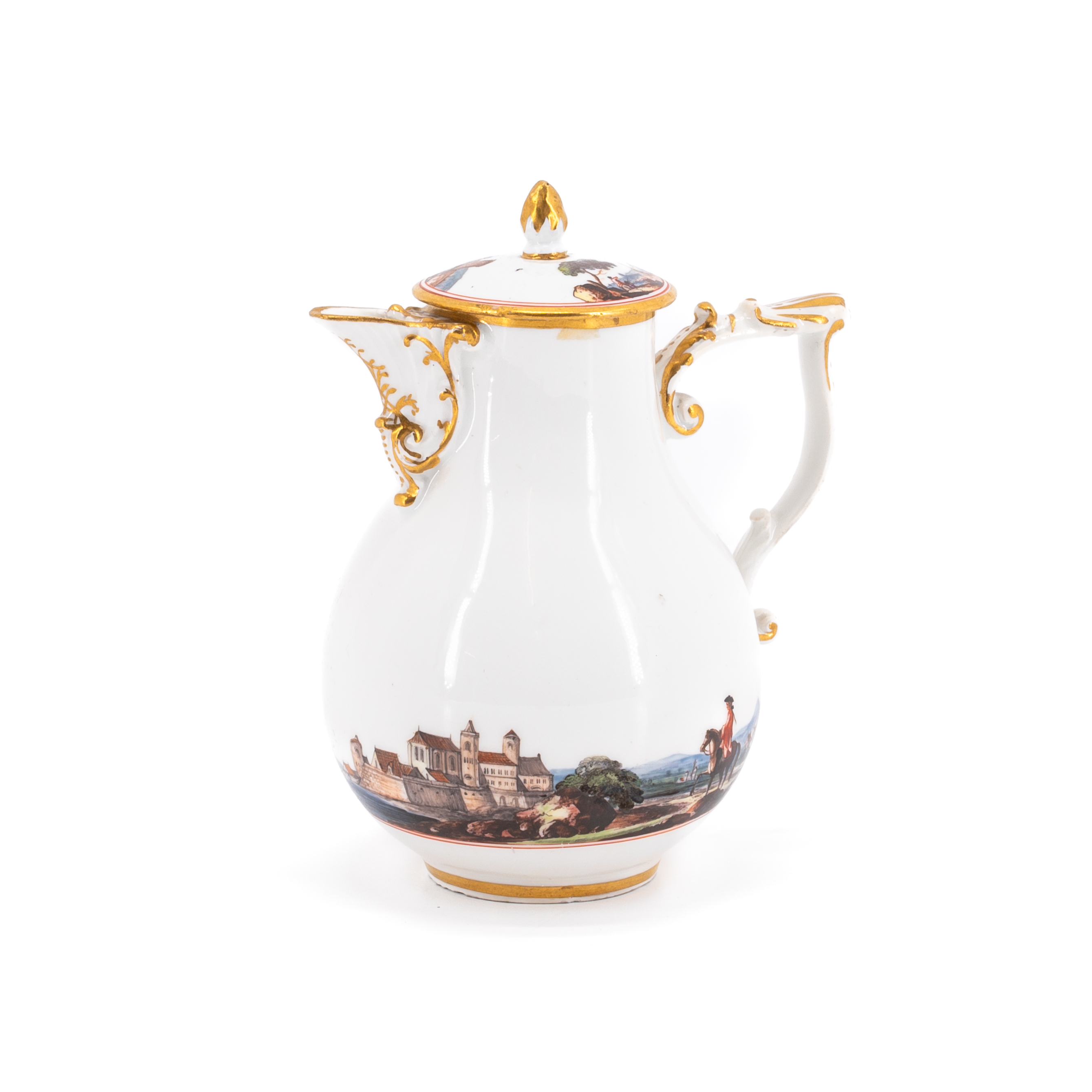 Beschreibung: Birnförmige kleine Kanne mit geschwungenem Henkel und Rocaille-geschmücktem Ausguss. Auf