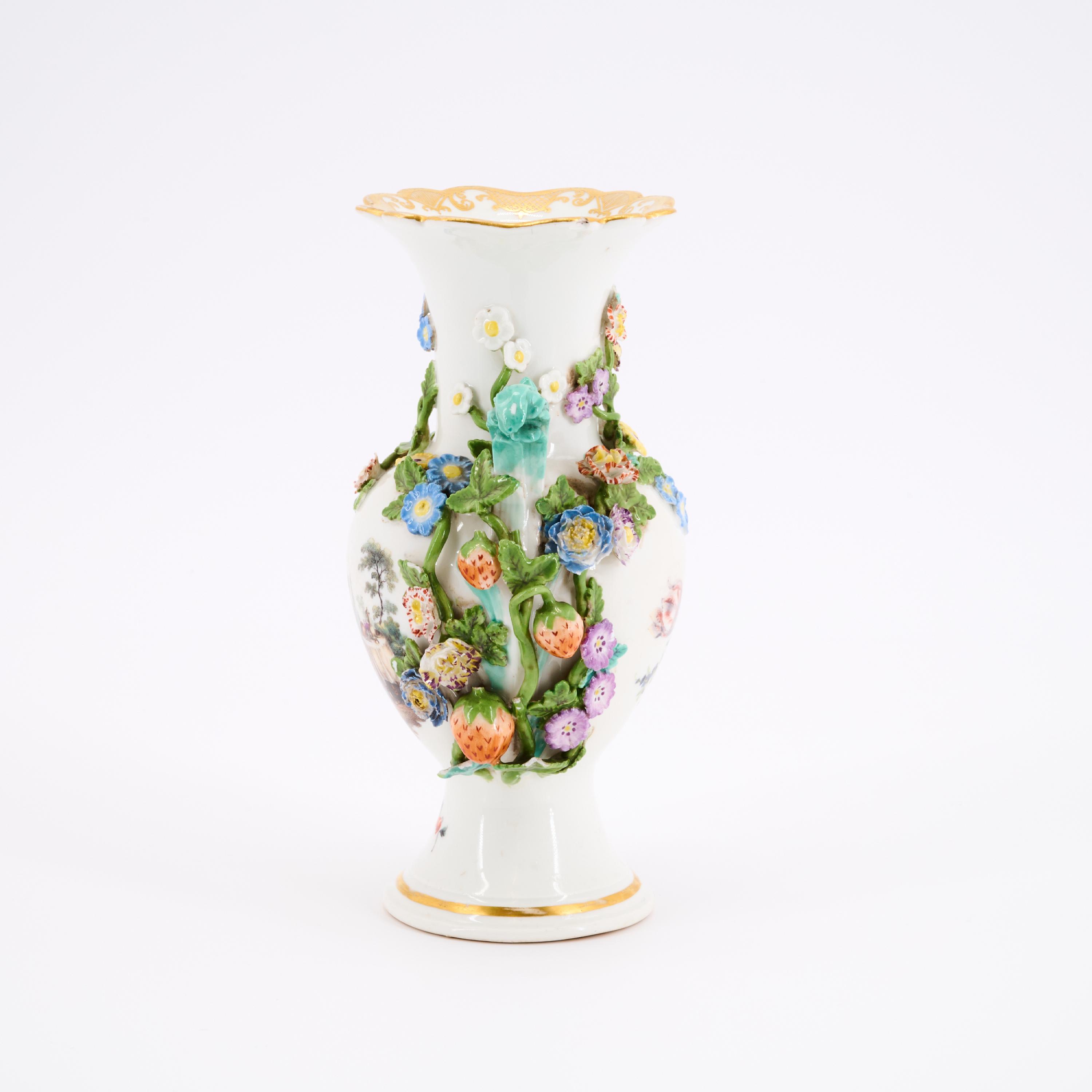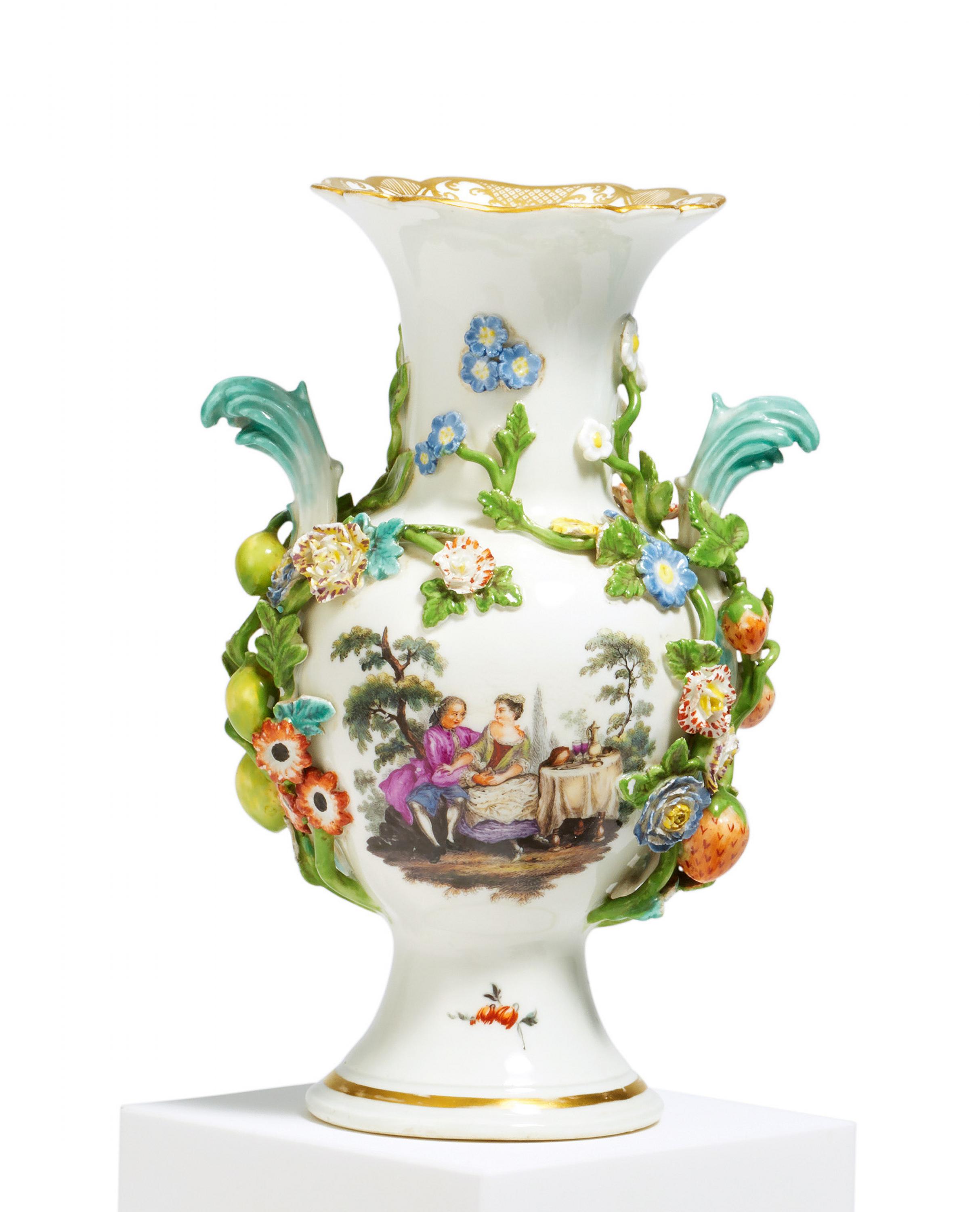 KLEINE VASE MIT PLASTISCHEN BLUMEN UND WATTEAUSZENE.