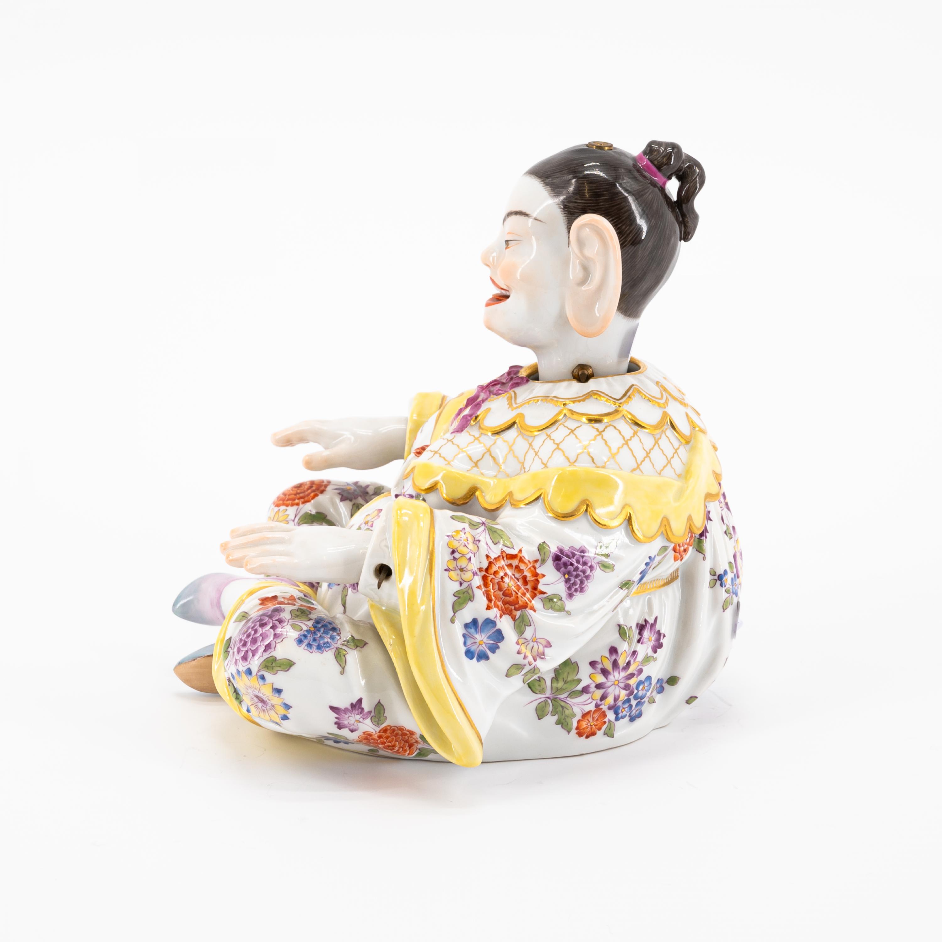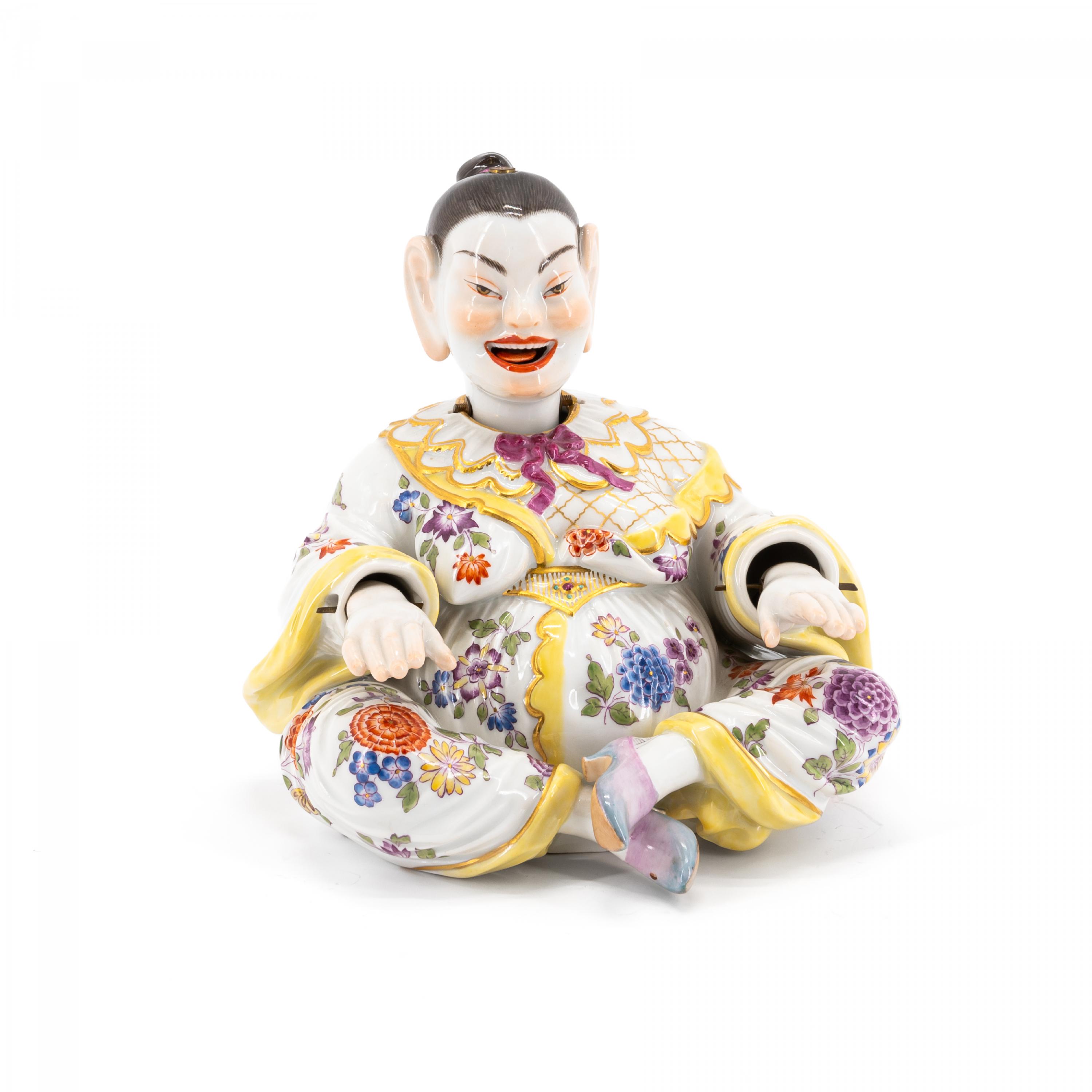 Beschreibung: Dickbäuchige Chinesin im Schneidersitz, mit reich dekoriertem Gewand mit indianischen