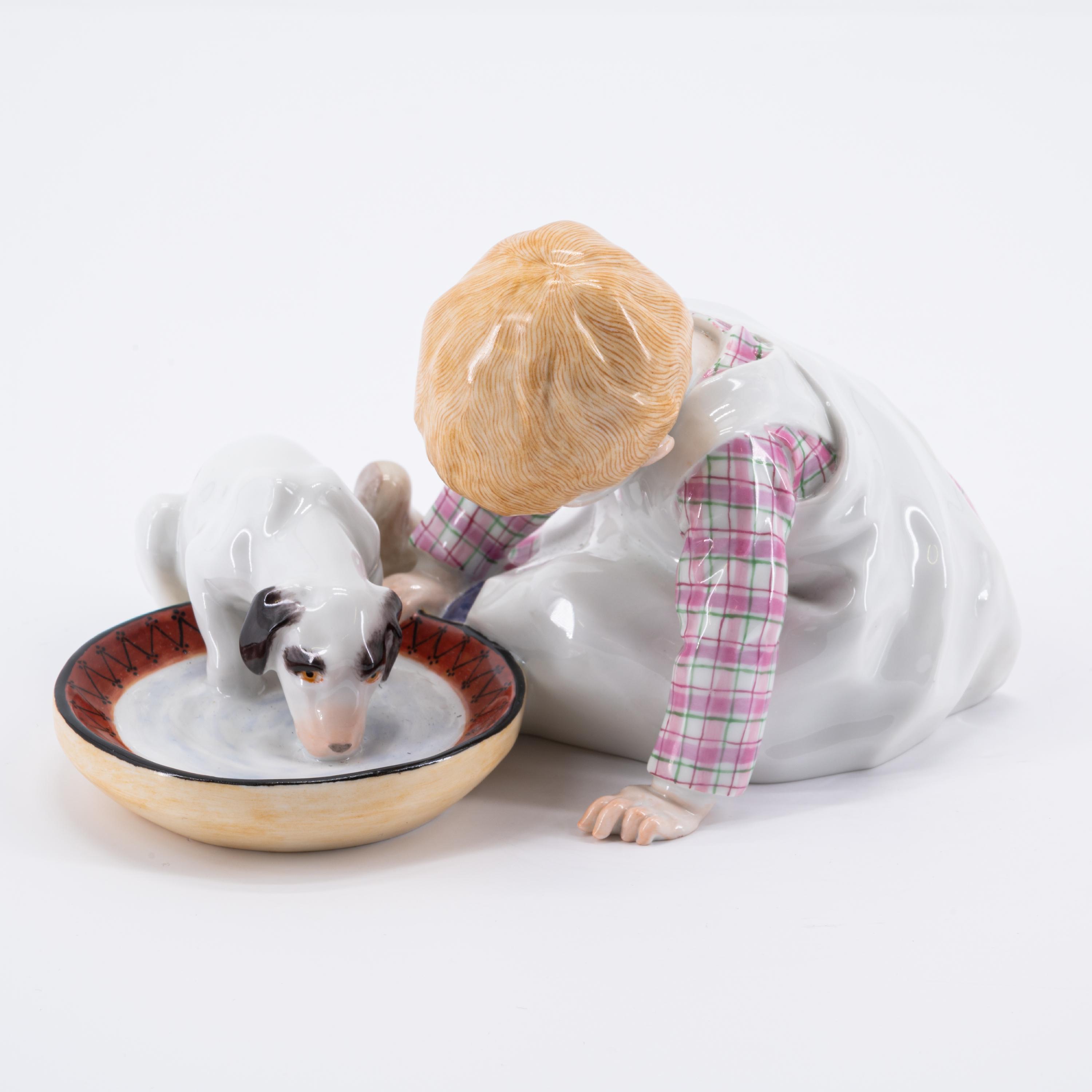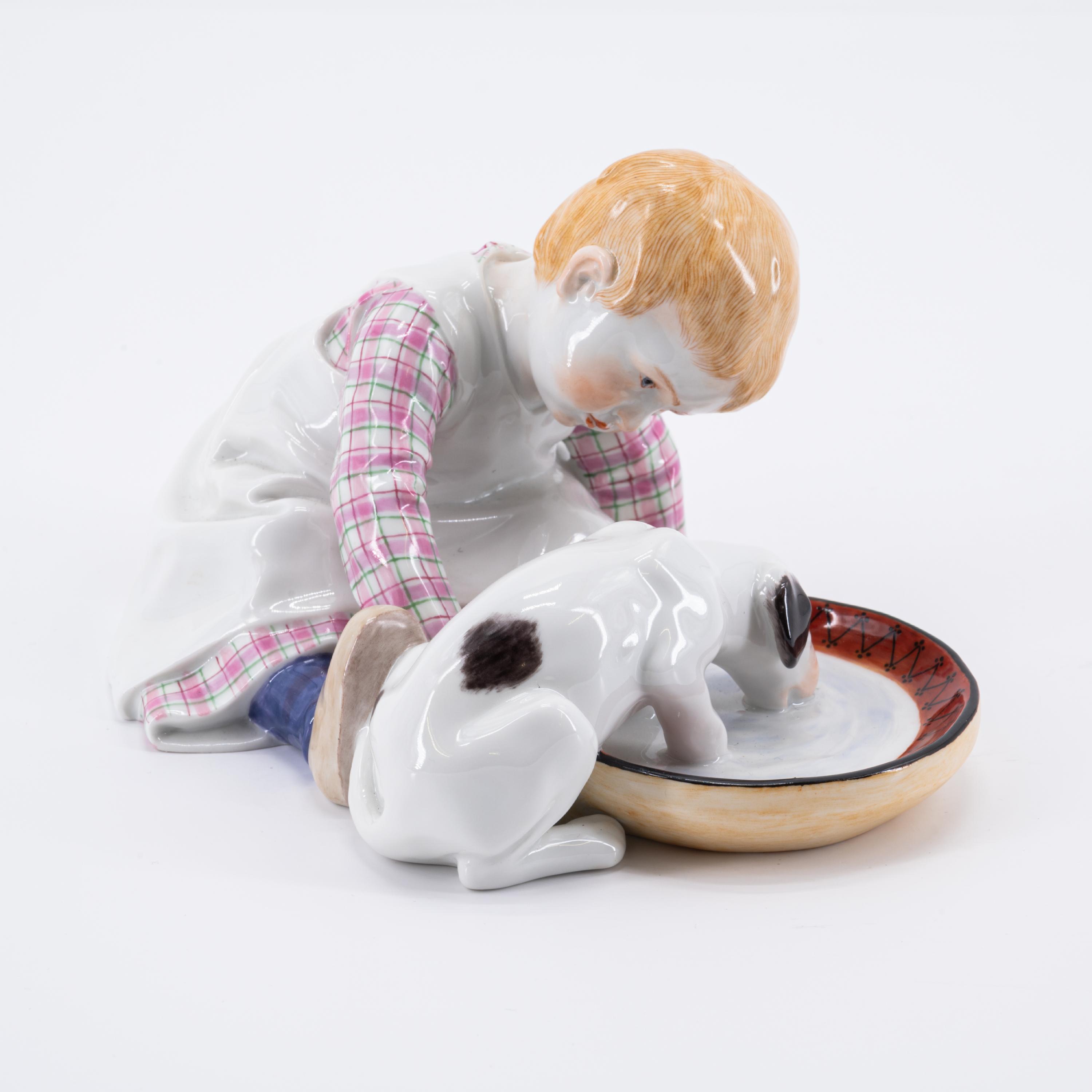 Beschreibung: Kleiner Junge auf dem Boden sitzend. Vor ihm eine große Schale mit Milch. Daraus ein