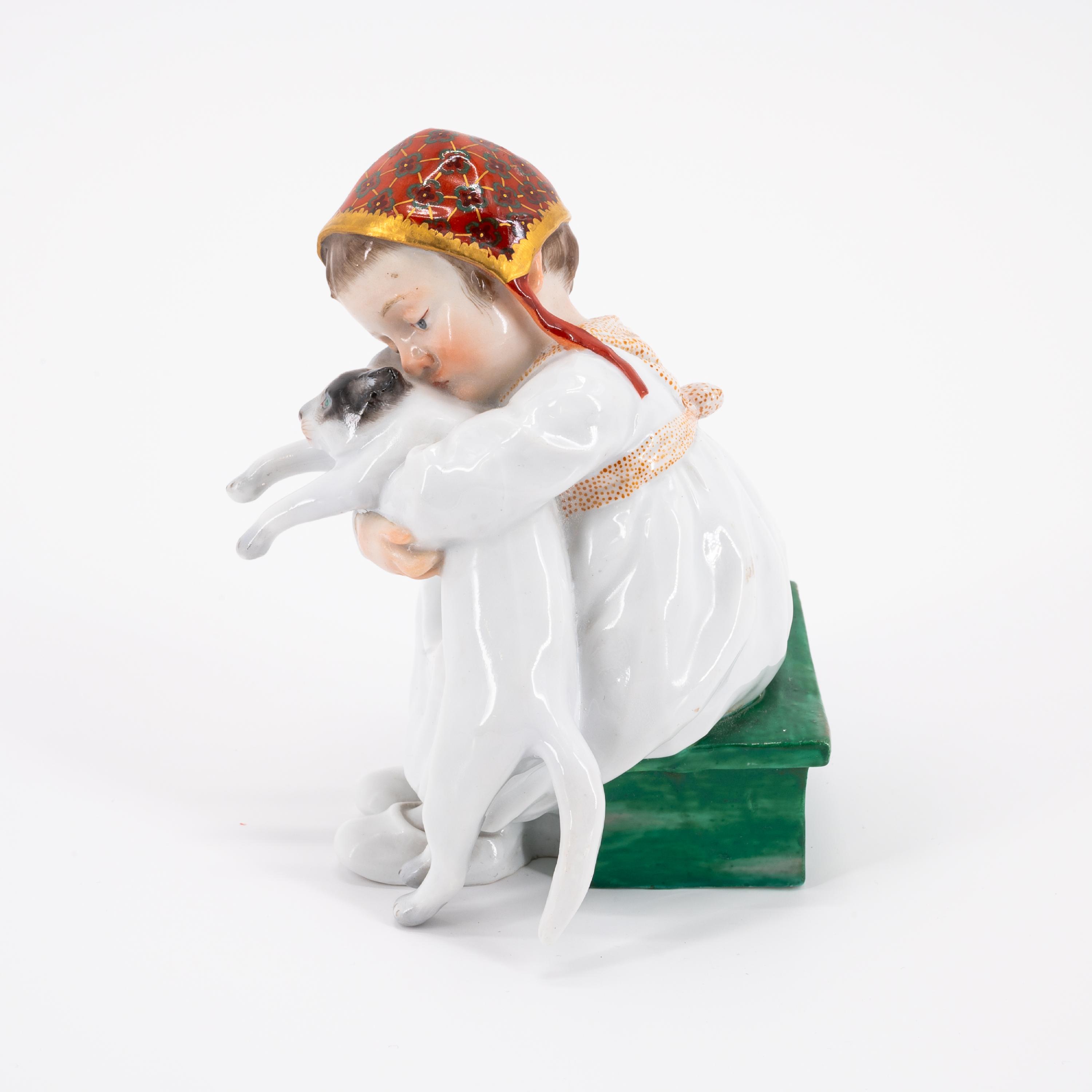 Beschreibung: Kleines Mädchen mit Mütze, welches auf einem grünen Sockel sitzt und eine kleine Katze in