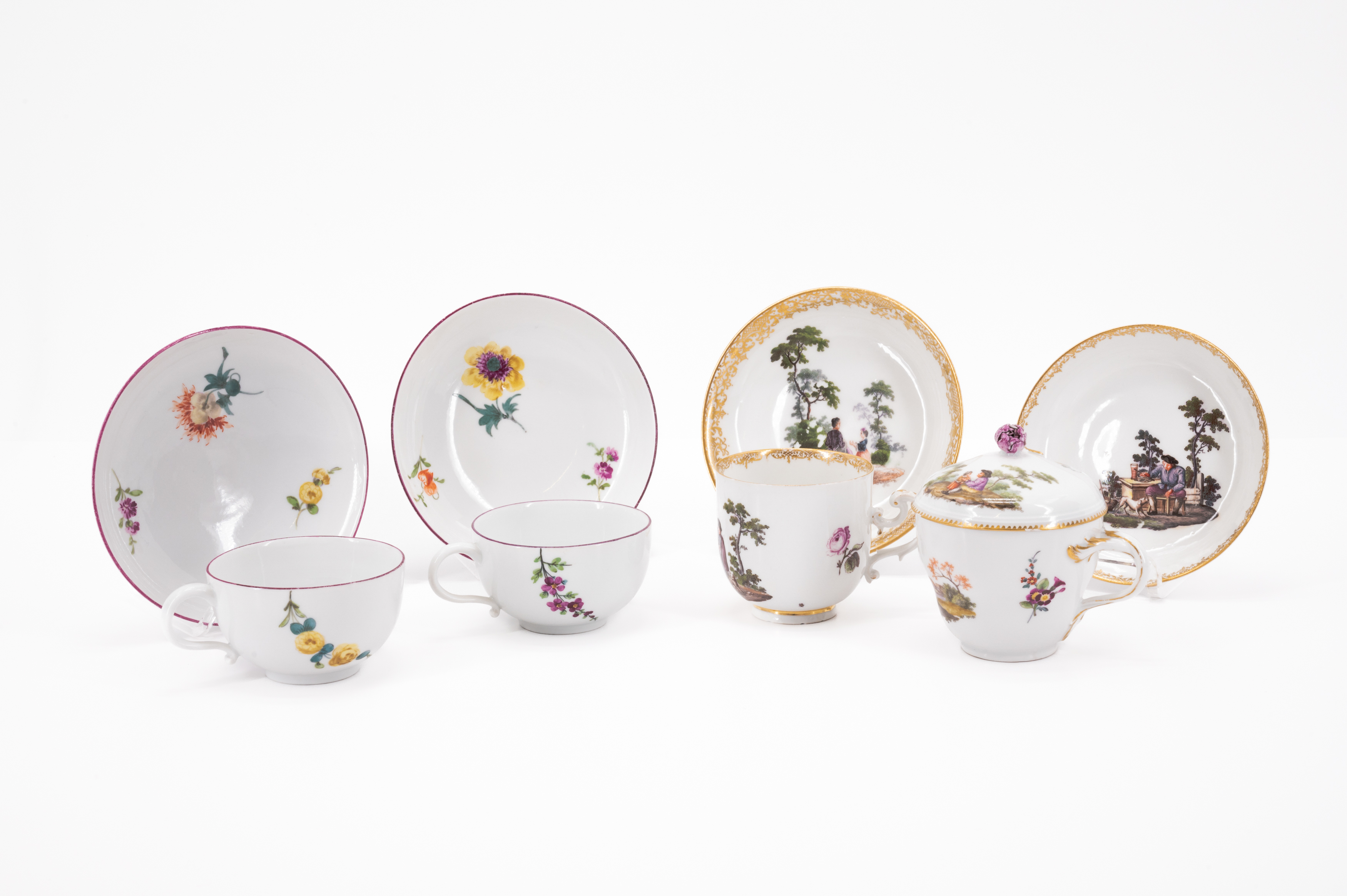 KONVOLUT VON 3 TASSEN UND 1 DECKELTASSE MIT UT MIT BLUMEN BZW. LÄNDLICHEN SZENEN.
