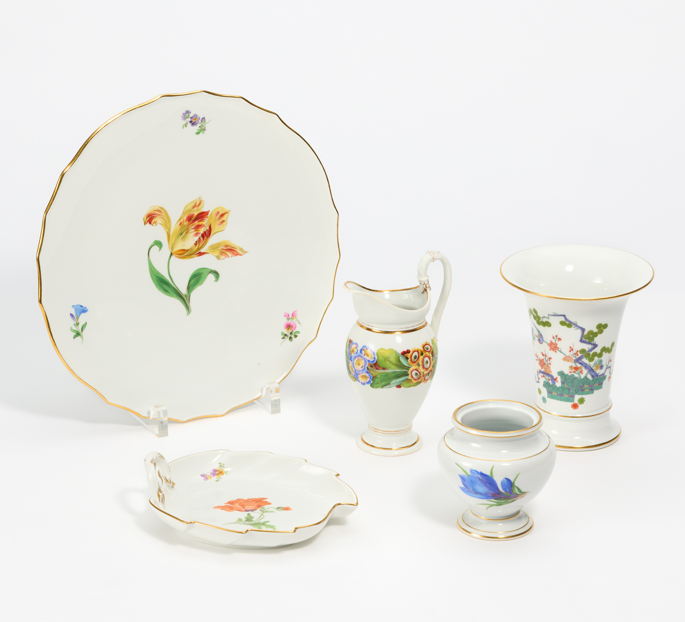 Maße: Ø Platte 31cm, H. Vasen 16/18,5/10,5cm, L. Schale 19cm.