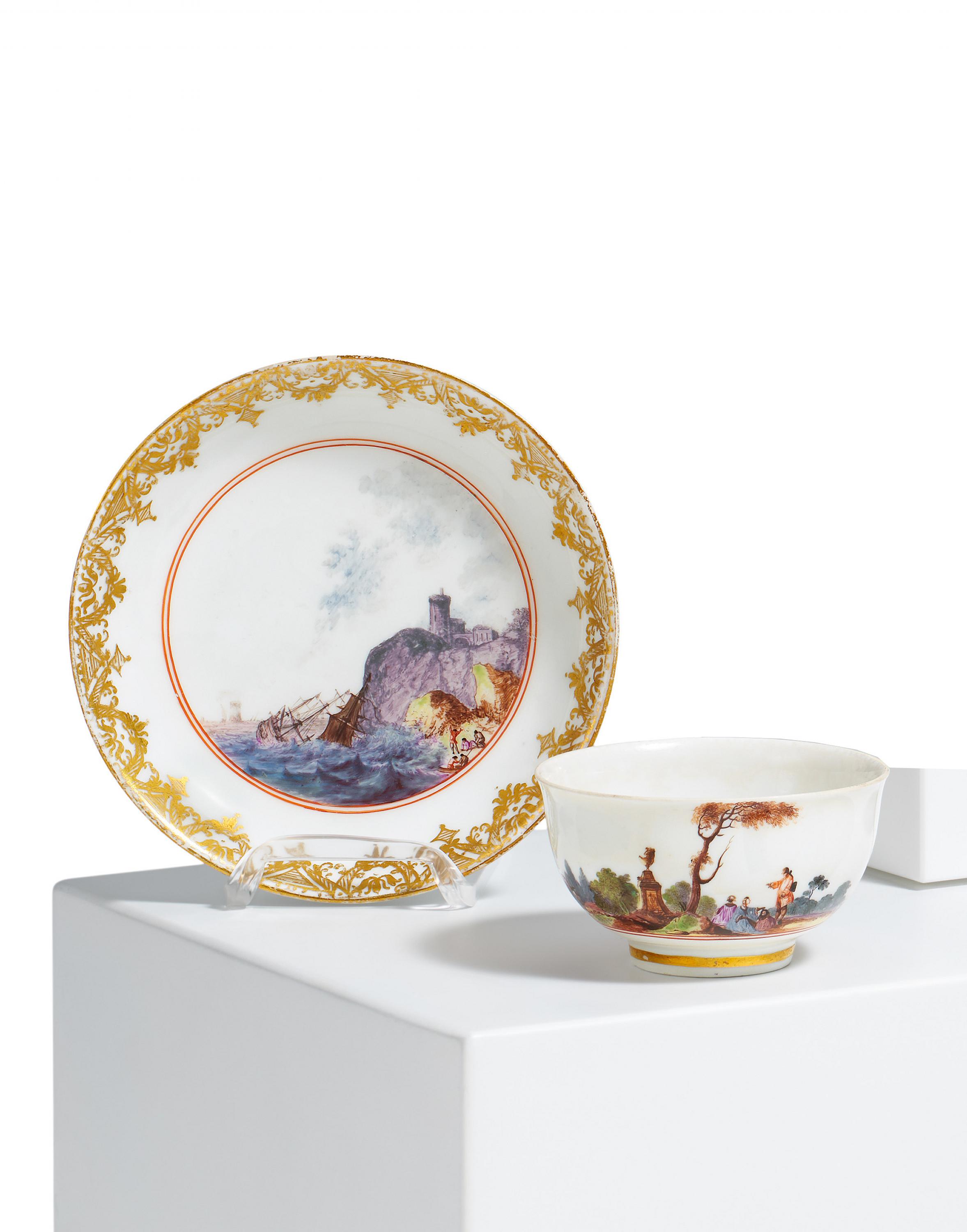 KOPPCHEN MIT UNTERSCHALE MIT UMLAUFENDER KÜSTENLANDSCHAFT UND SCHIFFSUNGLÜCK.