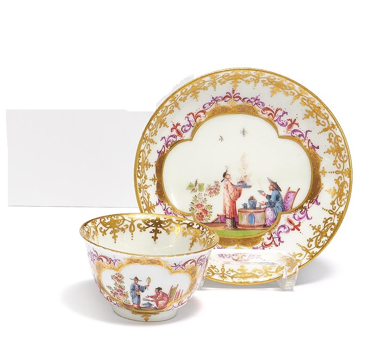 KOPPCHEN UND UNTERTASSE MIT CHINOISERIEN IN KARTUSCHEN MIT PURPURLÜSTER.
