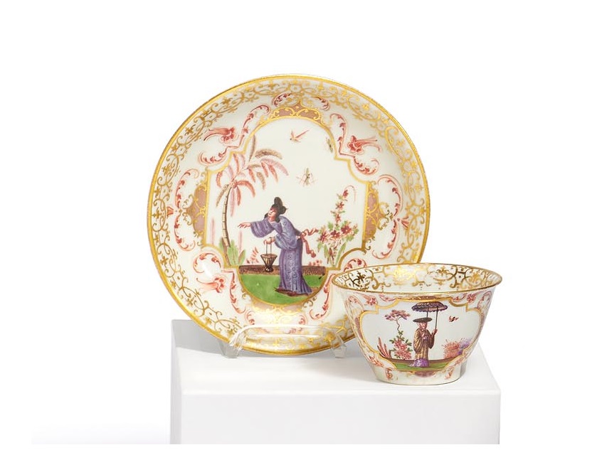 KOPPCHEN UND UNTERTASSE MIT GROßEN CHINOISERIEN.
