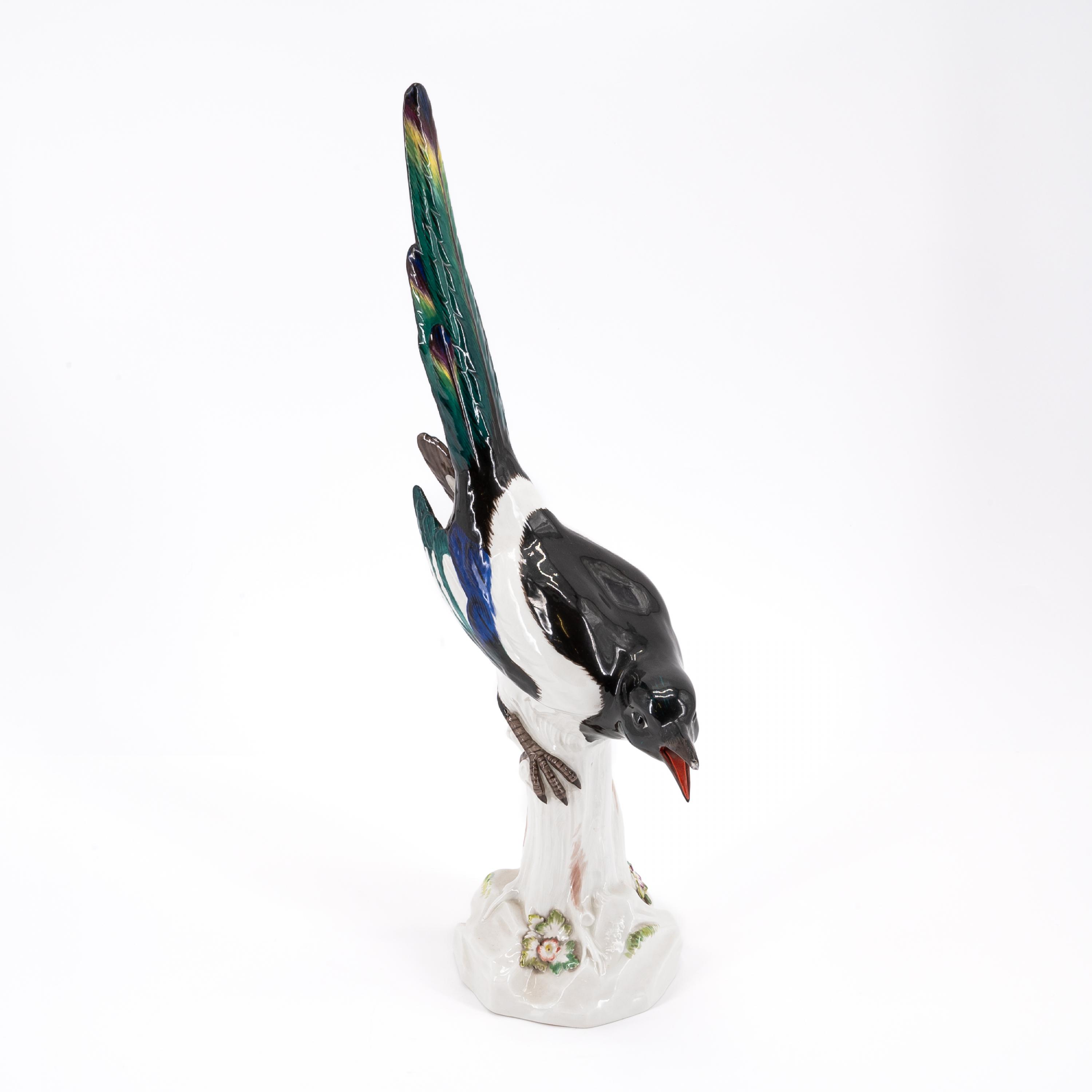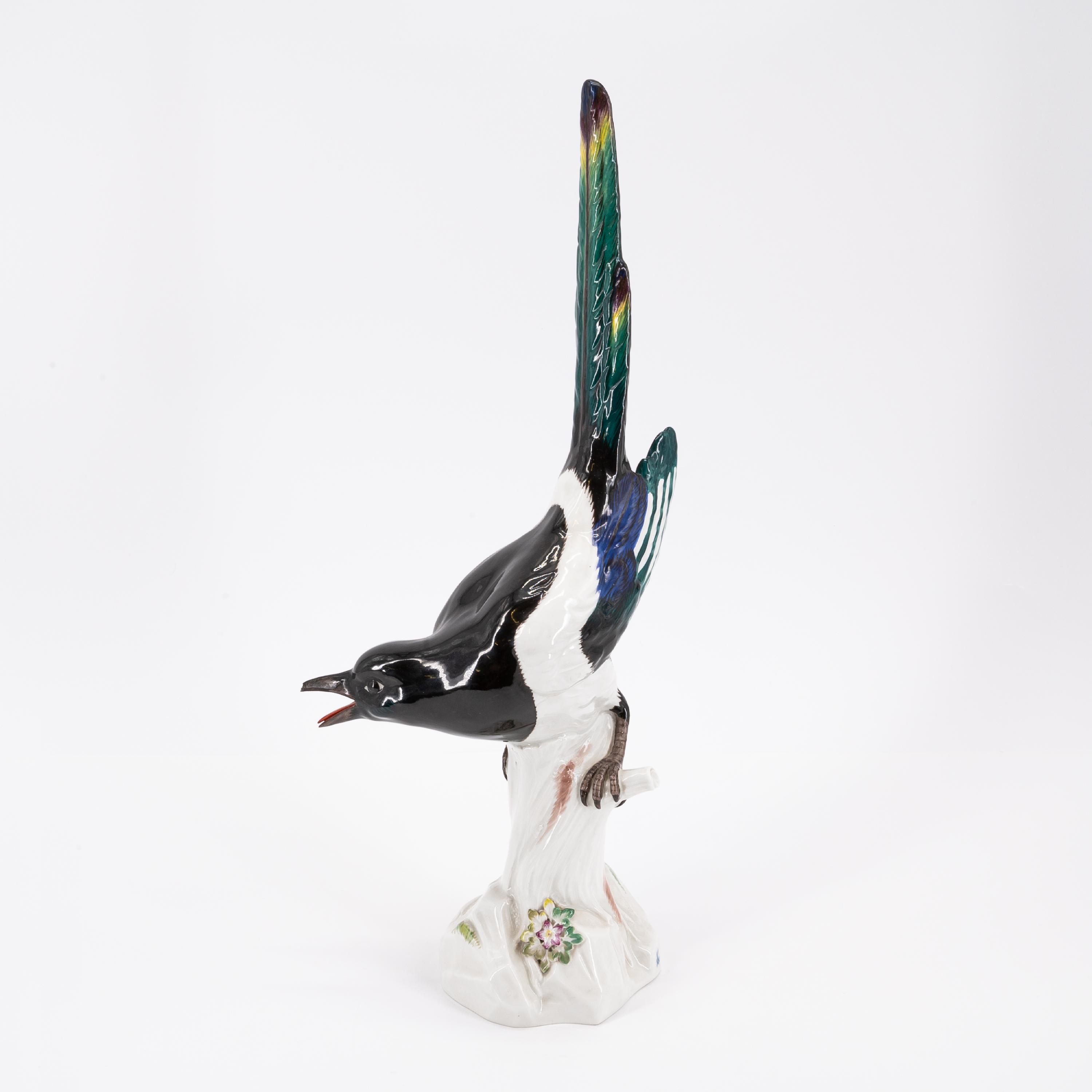 KRÄHENDE ELSTER AUF BAUMSTAMM.