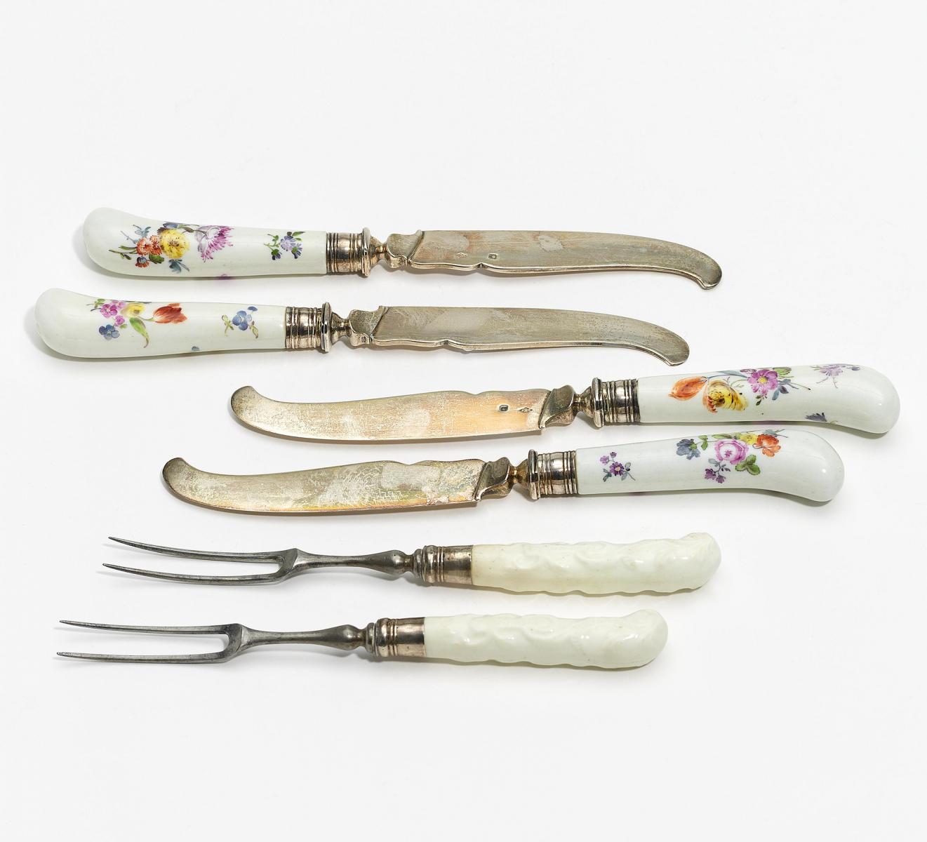 Technik: Porzellangriffe, farbig staffiert und Silberklingen (Frankreich).